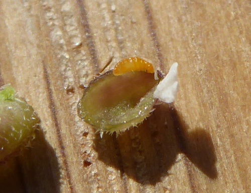 Cecidomyiid larvae are small maggots - white, yellow, orange or pink in colour. They usually have a ‘sternal spatula’ on the lower surface of the thorax; a tiny structure that (if present) is diagnostic of the family, although lost in a few species. Some larvae (e.g. Contarinia) can jump when disturbed.