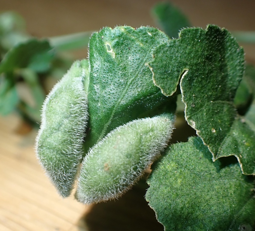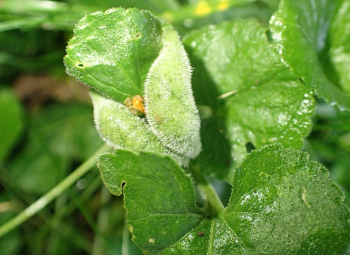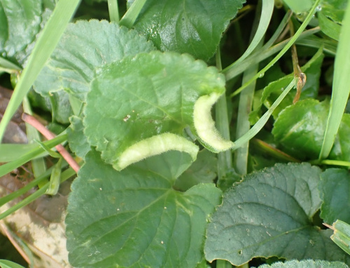 Dasineura odoratae is a midge causing gall on Viola odorata, the Sweet Violet. The margins of the leaf are rolled upwards, and are hairy. White larvae, later orange-yellow, inside.