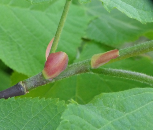 Large-leaved Lime can grow up to 35 metres tall. Leaves are 6-11 cm, hairy on the underside, especially on the veins, with many off-white hairs (not just in the leaf axils) and have a sharply toothed margin and heart-shaped base. The young twigs are hairy. Flower cymes pendent.