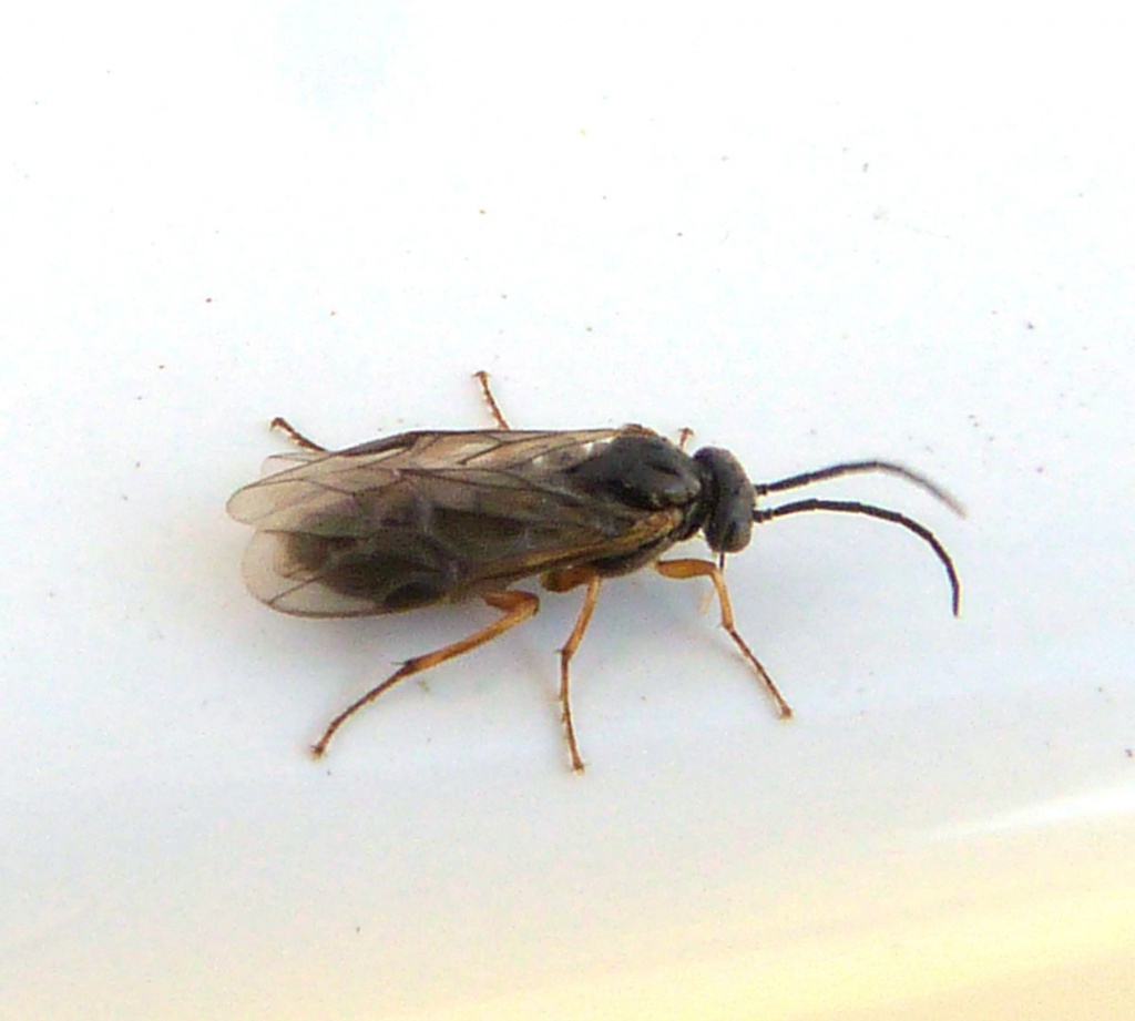Pristiphora appendiculata has a black abdomen and pale yellow legs. There are other similar species and detailed examination is necessary. The larva gall the leaves of various Ribes species such as Red Currant or Gooseberry.