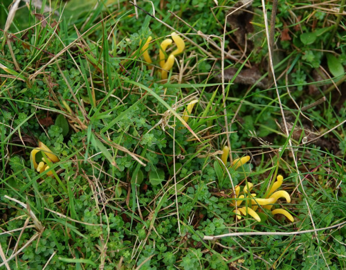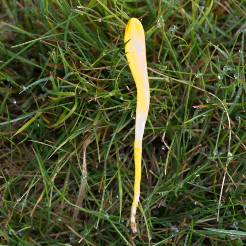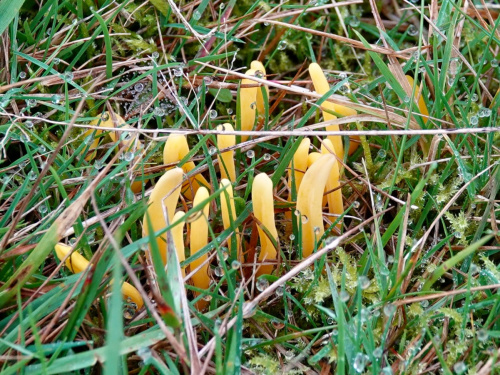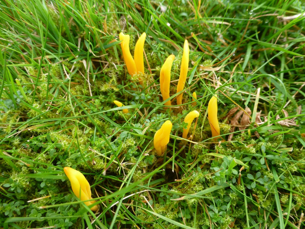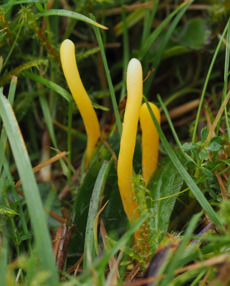 The yellow unbranched clubs growing in grassland.may either be Golden Spindles (Clavulinopsis fusiformis), Yellow Club (Clavulinopsis helvola) or Apricot Club (Clavulinopsis luteoalba). It is very hard to separate these in the field. Microscopic examination of spores is needed, but it can be difficult to identify the smooth-spored species.