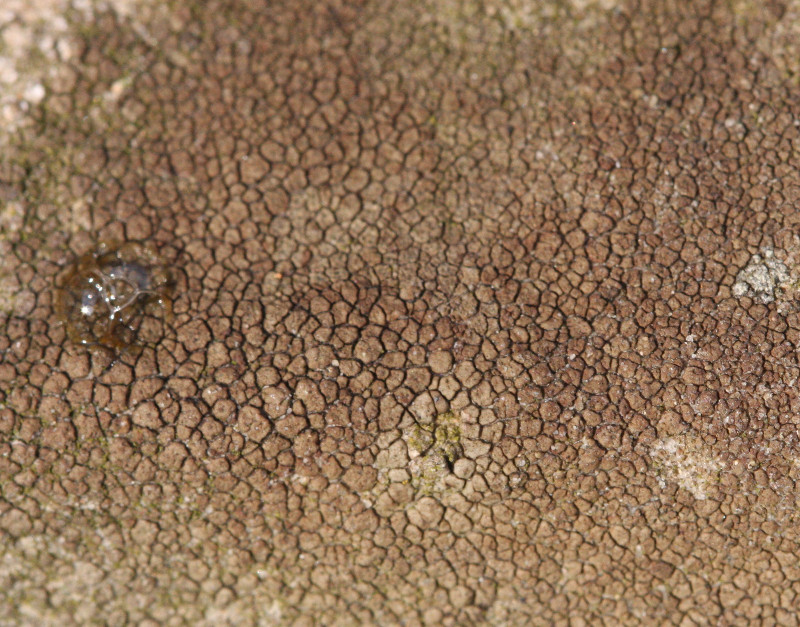 This is a crust forming lichen which may vary in colour from a yellowy brown to greyer brown. The surface is often warted due to crystal aggregation.