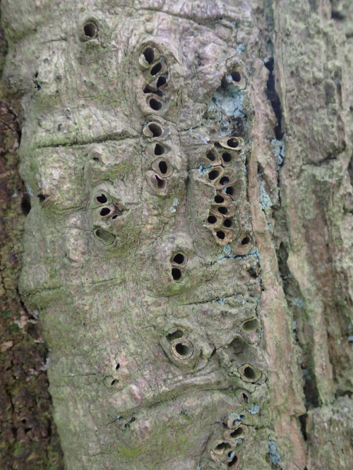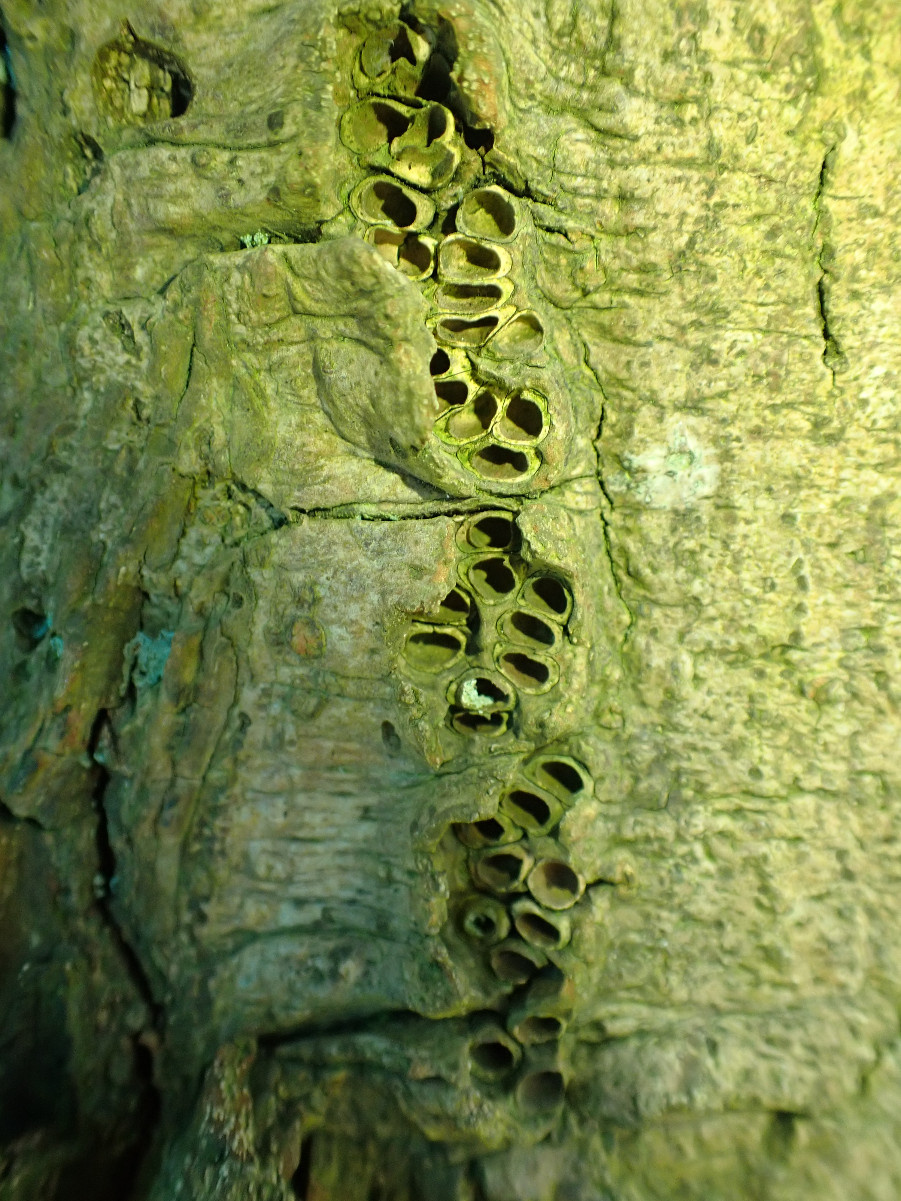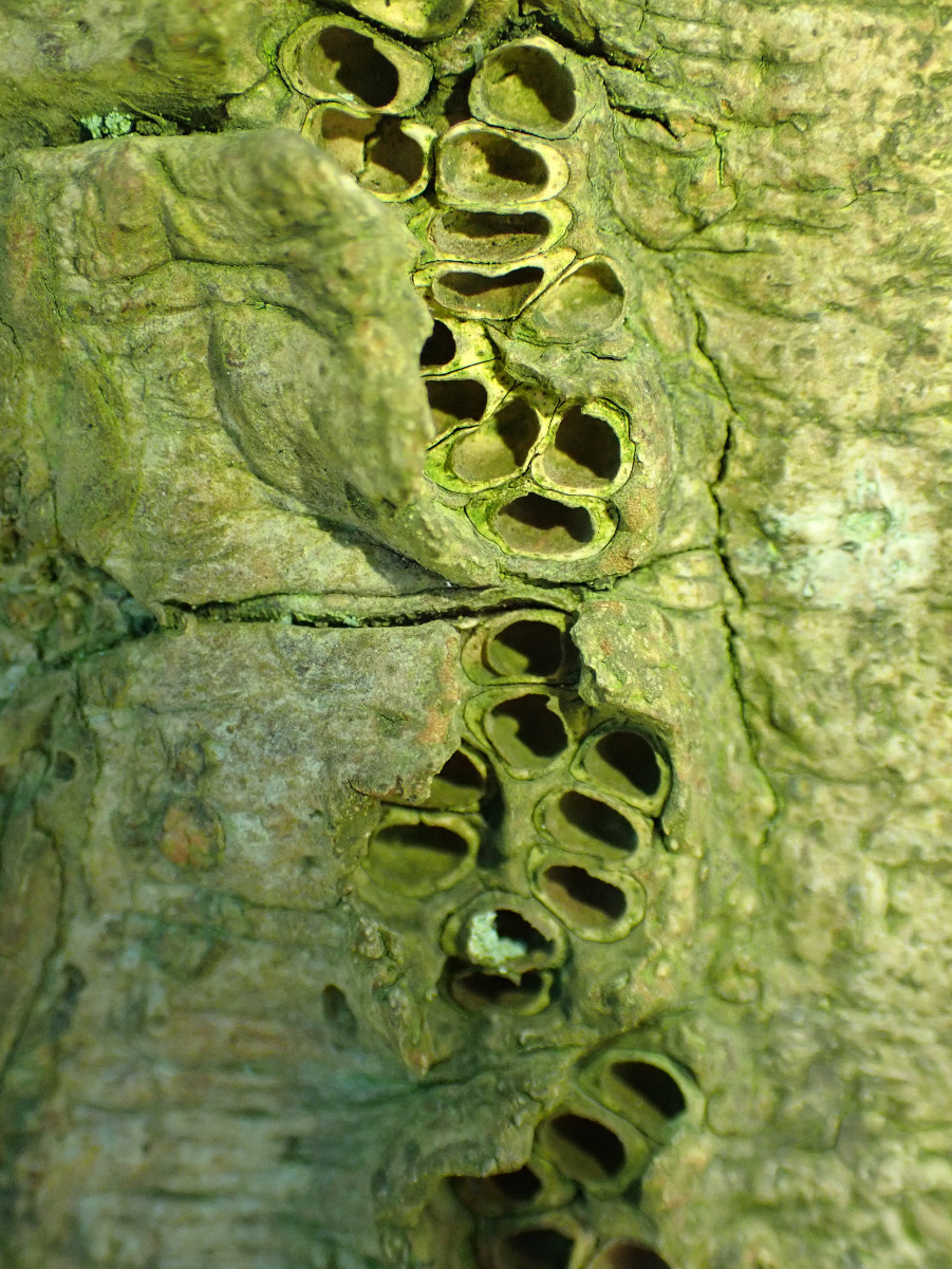The agamic barnacle galls (Andricus sieboldii and testaceipes) also form on oak tree trucks, usually close to the ground, but are conical and ridged.