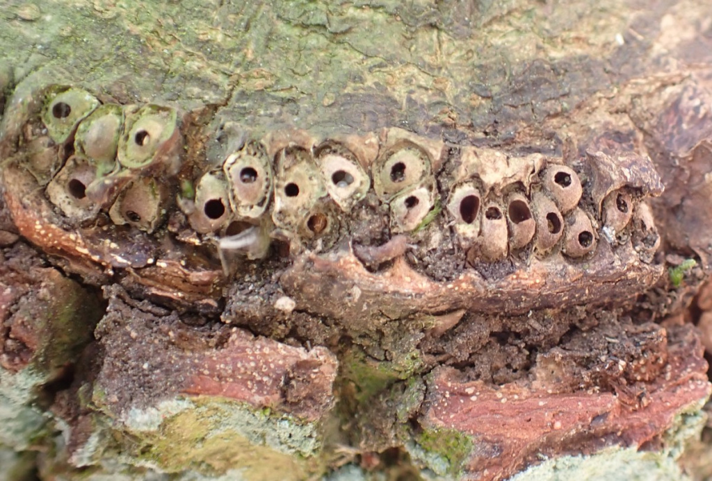 The agamic galls are ovoid; they occur in clusters and are embedded in the bark on the oak tree-trunk; eventually only the empty galls or sockets persisting. They are usually found in callus tissue that forms around wounds on the main trunk.