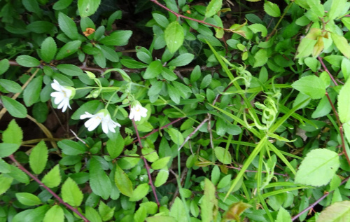 The aphids cause galls on Greater Stitchwort. The leaves at the shoot tip become thickened, distorted and bunched up, sometimes twisted and with inrolled margins
