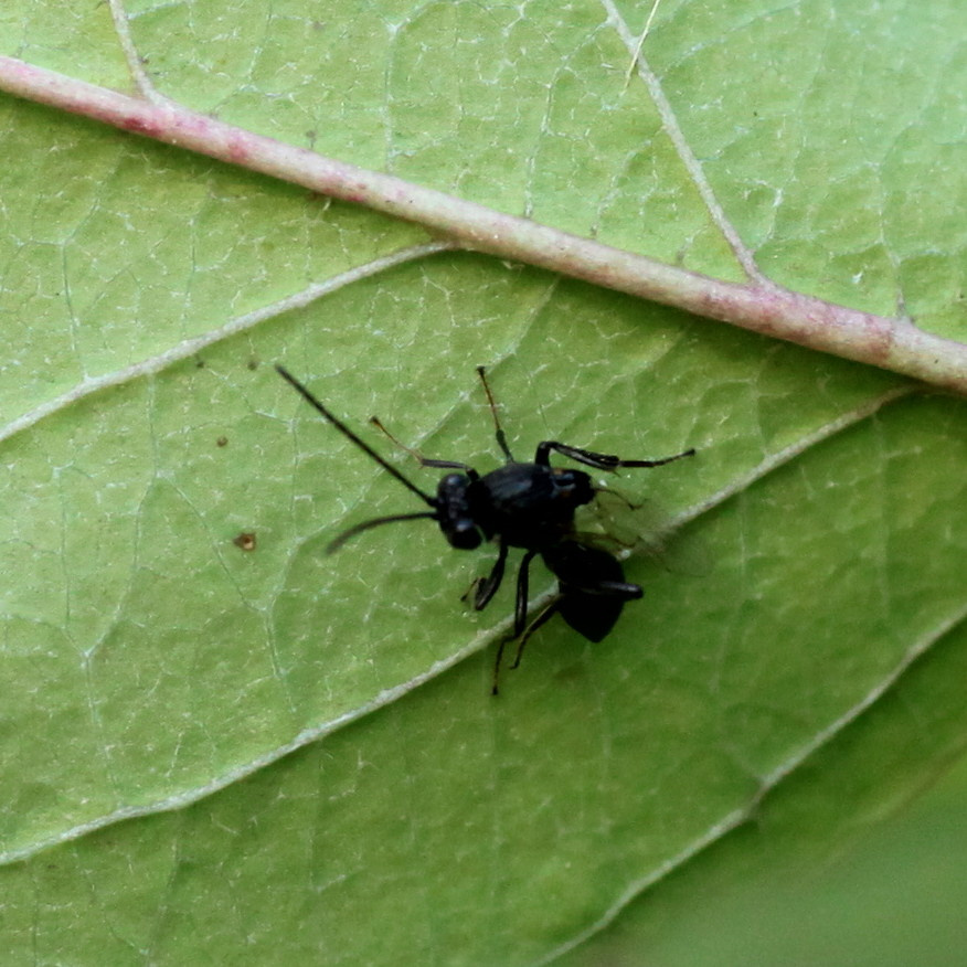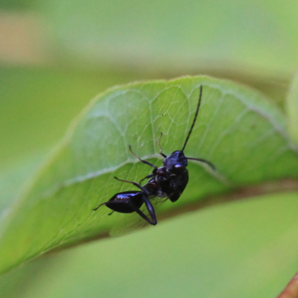 See these notes from Phil Booker's YouTube post in 2024: " . . . .Callaspidia defonscolombei is almost entirely black with a slightly curved thorax and distinctive scutellum (a shieldlike bony plate or scale, as on the thorax) the base of which is reddish as are the antennae and lower legs in the right light. The abdomen attaches to the thorax at the base."