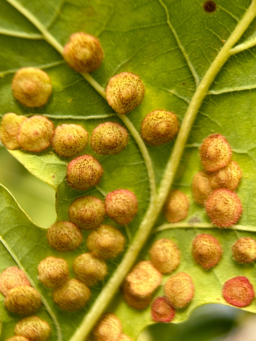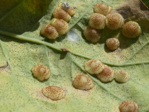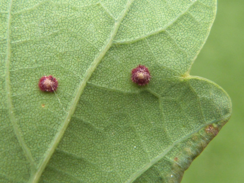 The agamic Spangle Galls can be very abundant on the undersides of Oak leaves in autumn. They are disc-shaped with a central bulge and are covered with tufts of reddish hairs. No structure is visible on the upper leaf surface but it is often discoloured.