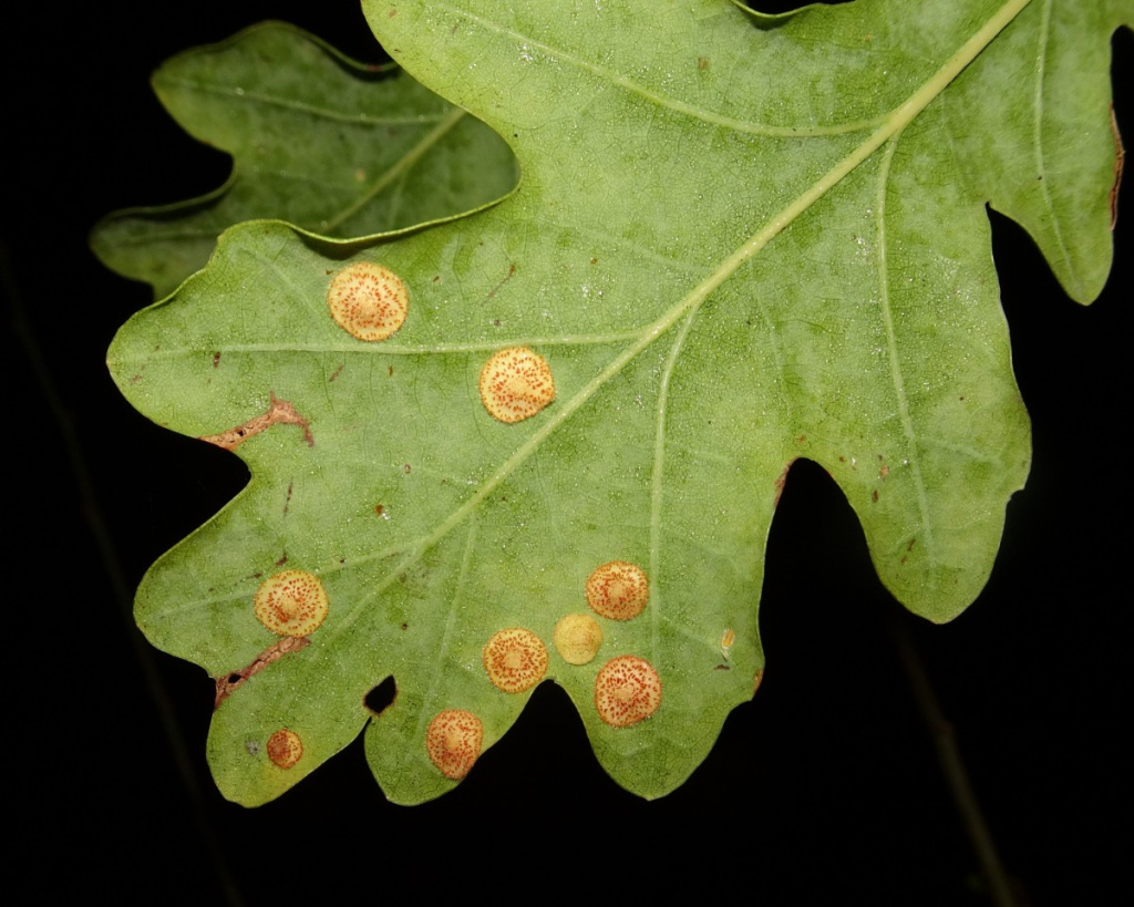 The agamic (asexual) Spangle Galls fall from the leaf in autumn and the larvae overwinter in leaf litter.