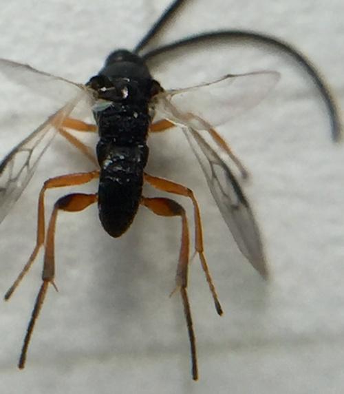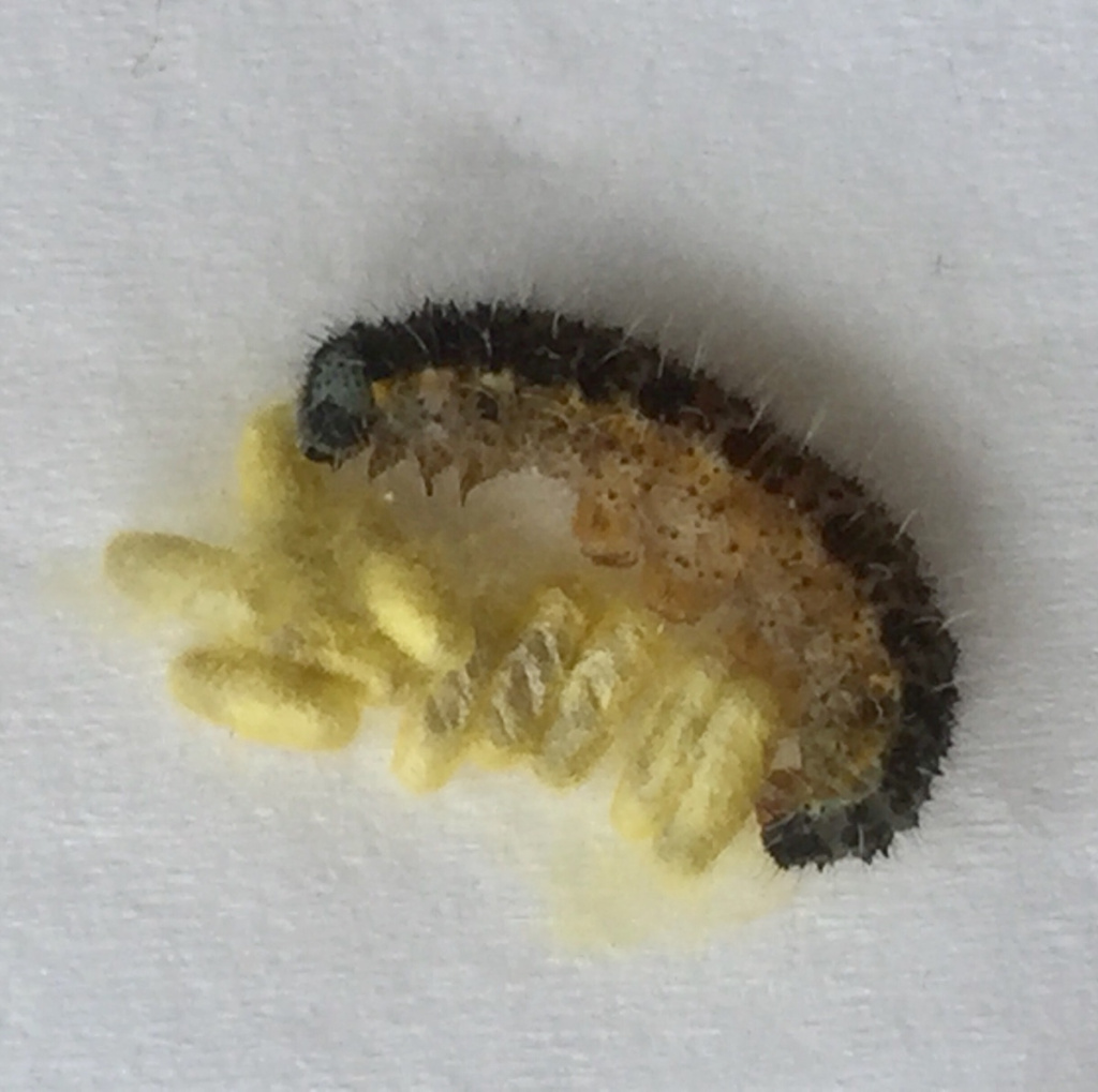 This small wasp is a parasitoid of white butterfly caterpillars. The adult is black with red legs. It is rarely found but can be reared from an affected caterpillar - particularly the caterpillars of Large and Small White butterflies.