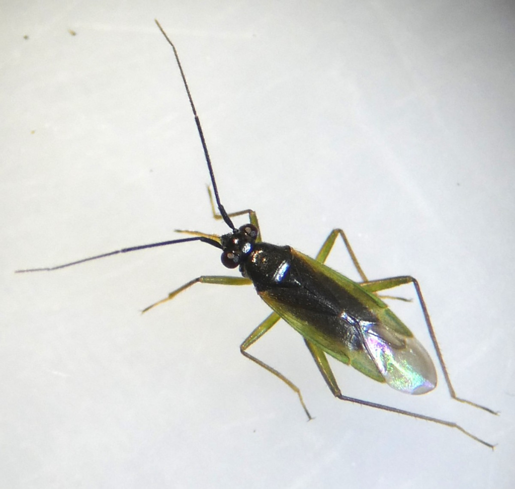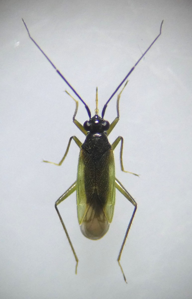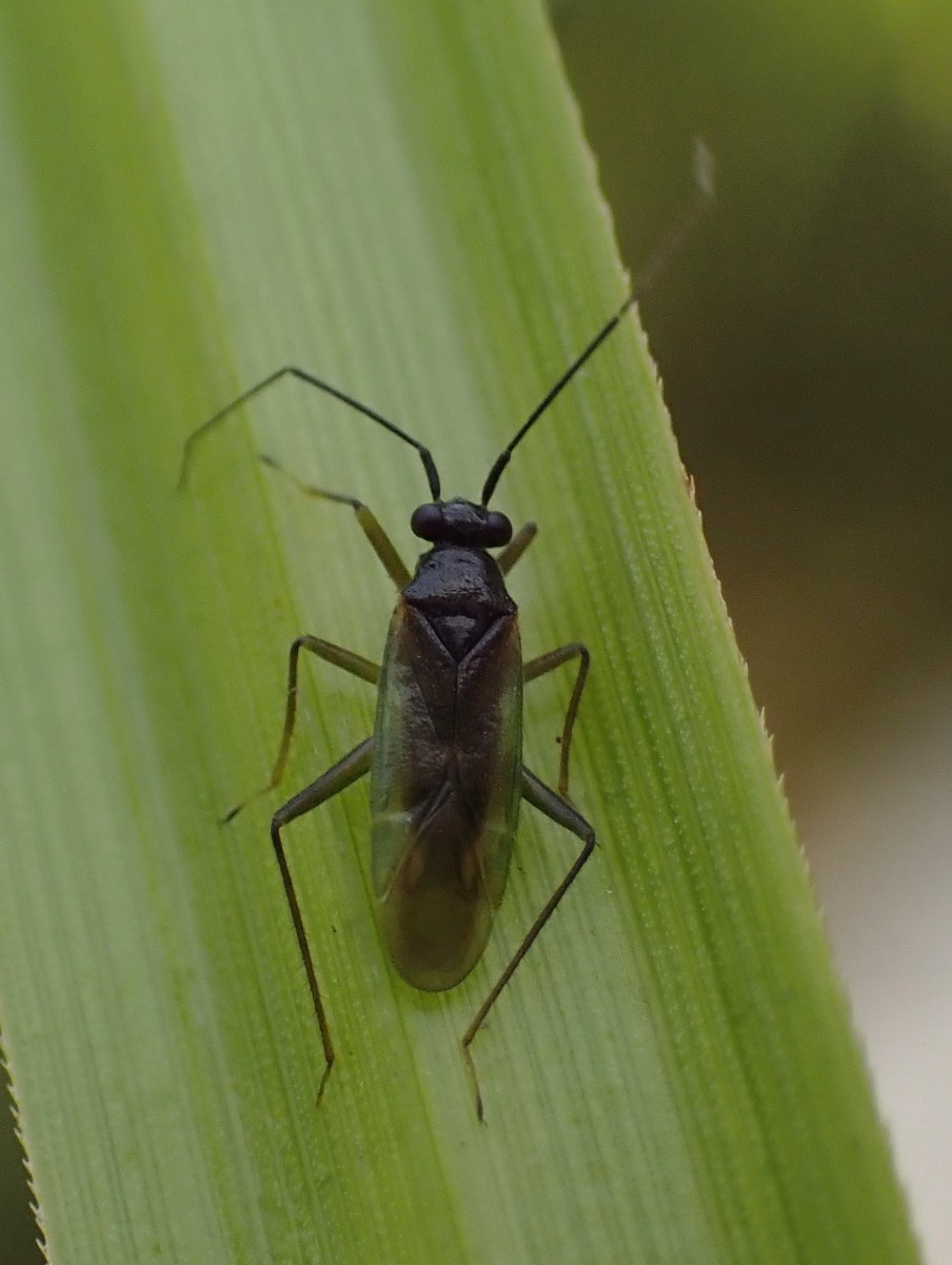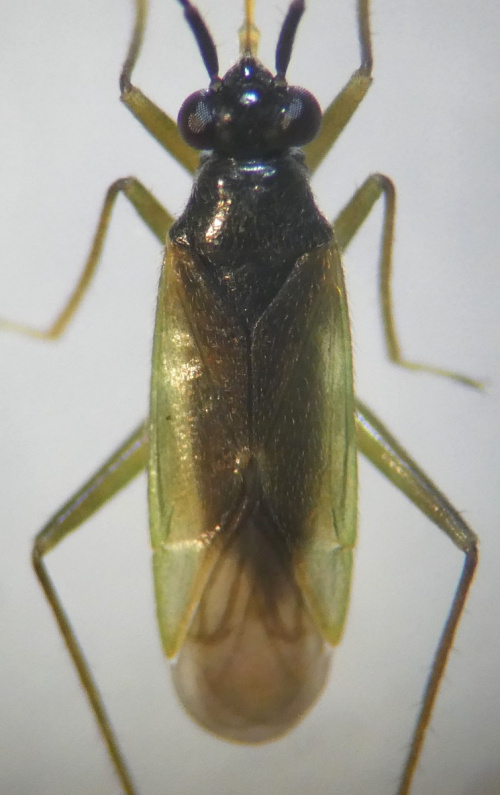 A small and very lively carnivorous bug assocated with wetland sedges and rushes. The forewing are greenish with a dark strip down the centre, legs are greenish-brown, and the antennae are black.