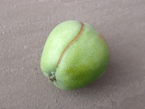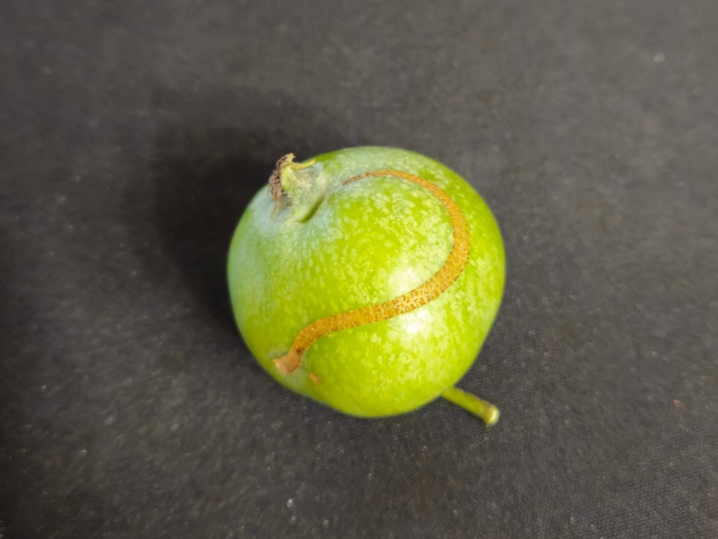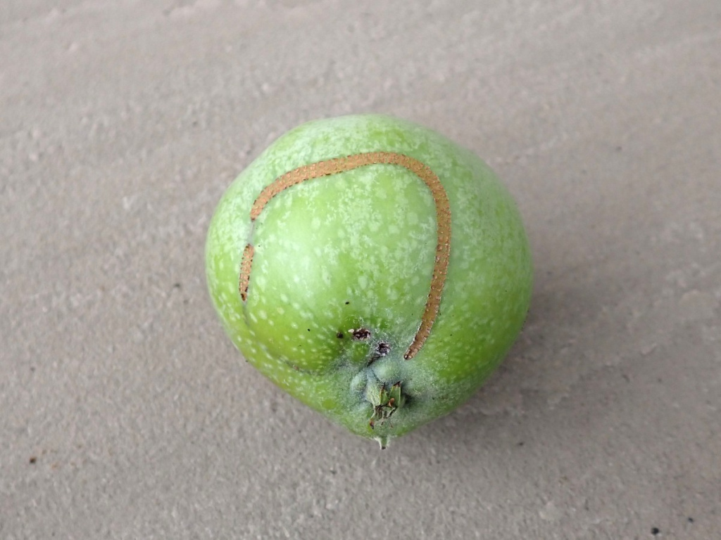6-7mm. Adults are black on top but orange elsewhere, with a black spot on top of the orange head. Legs are orange. Eggs are laid on apple blossom and the larva feed on the developing fruit causing surface scarring.