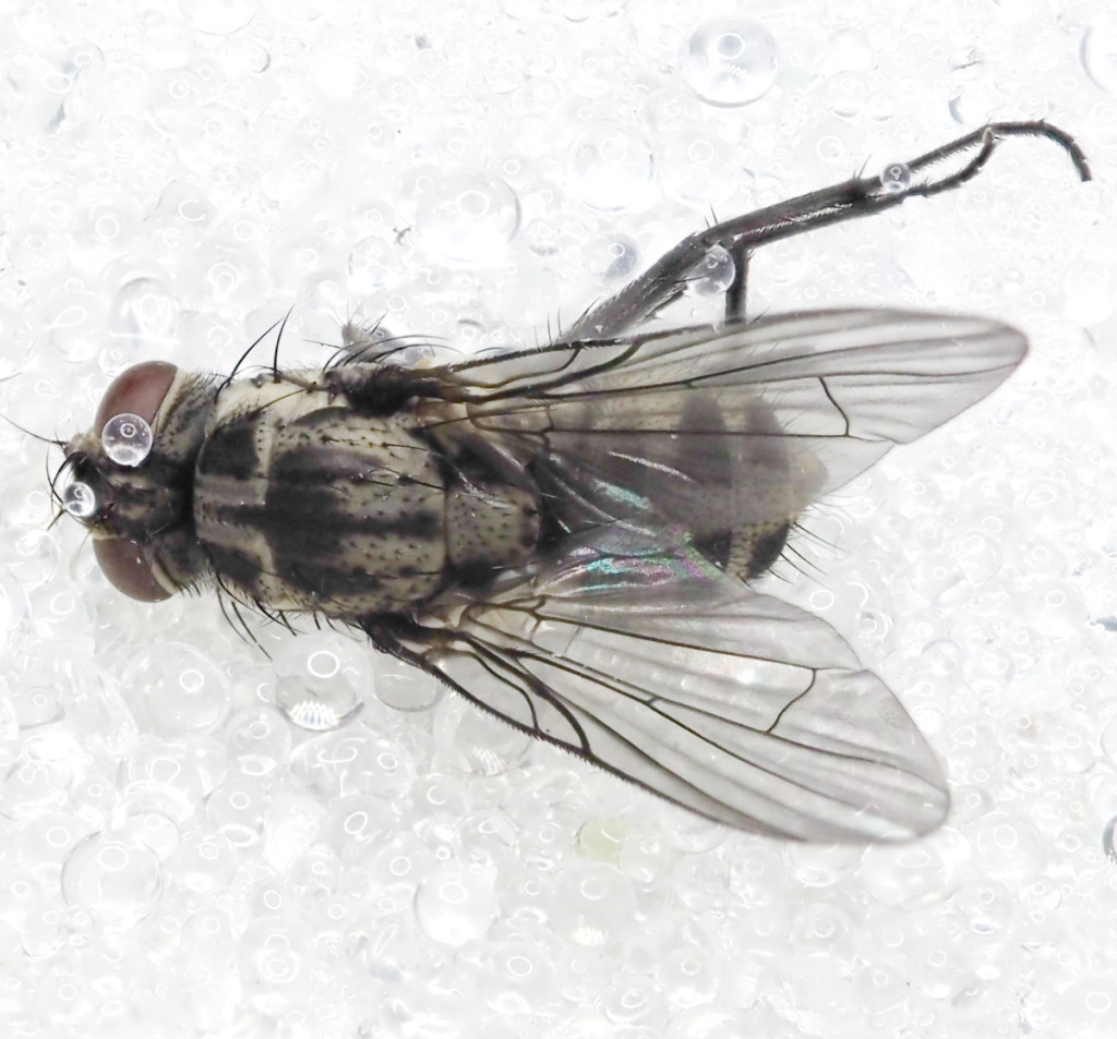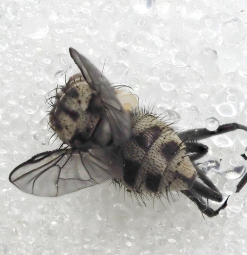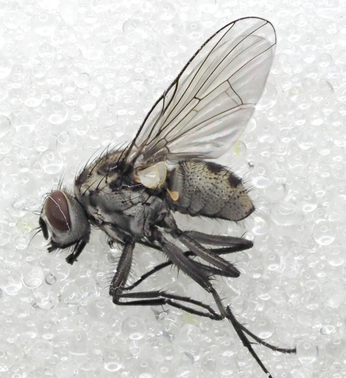 4-6.5mm. Grey with a distinctive pattern of black on the thorax and paired triangular black spots on the abdomen. It has four pairs of post-sutoral dorsocentrals. The halteres are yellow. The legs are all dark.