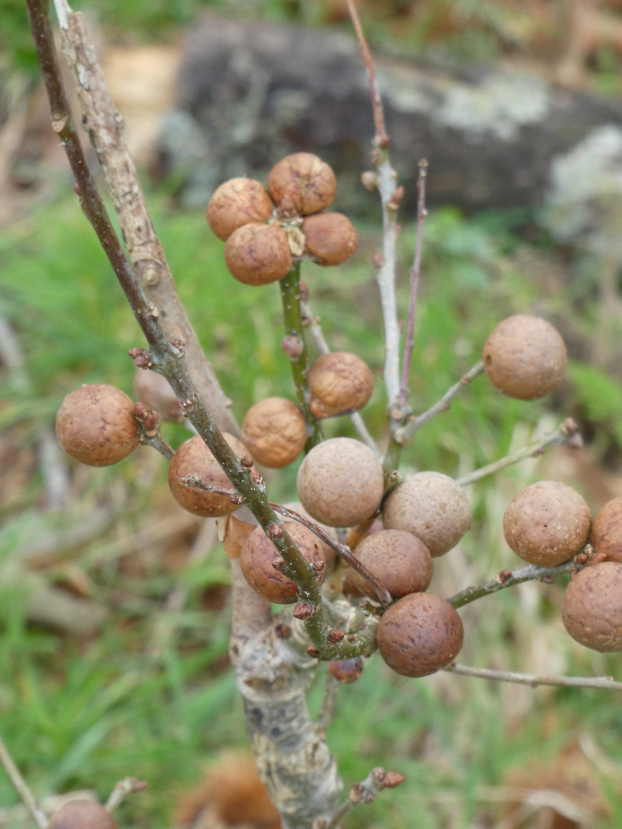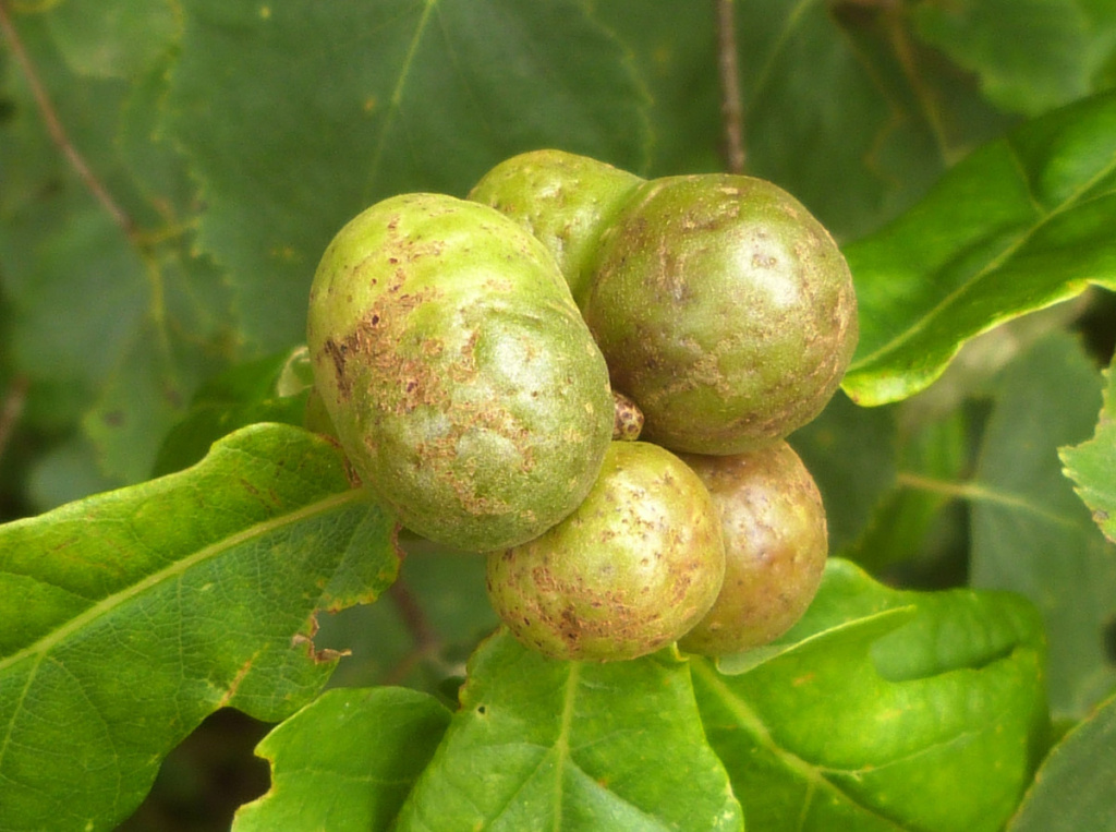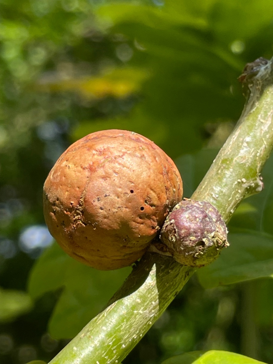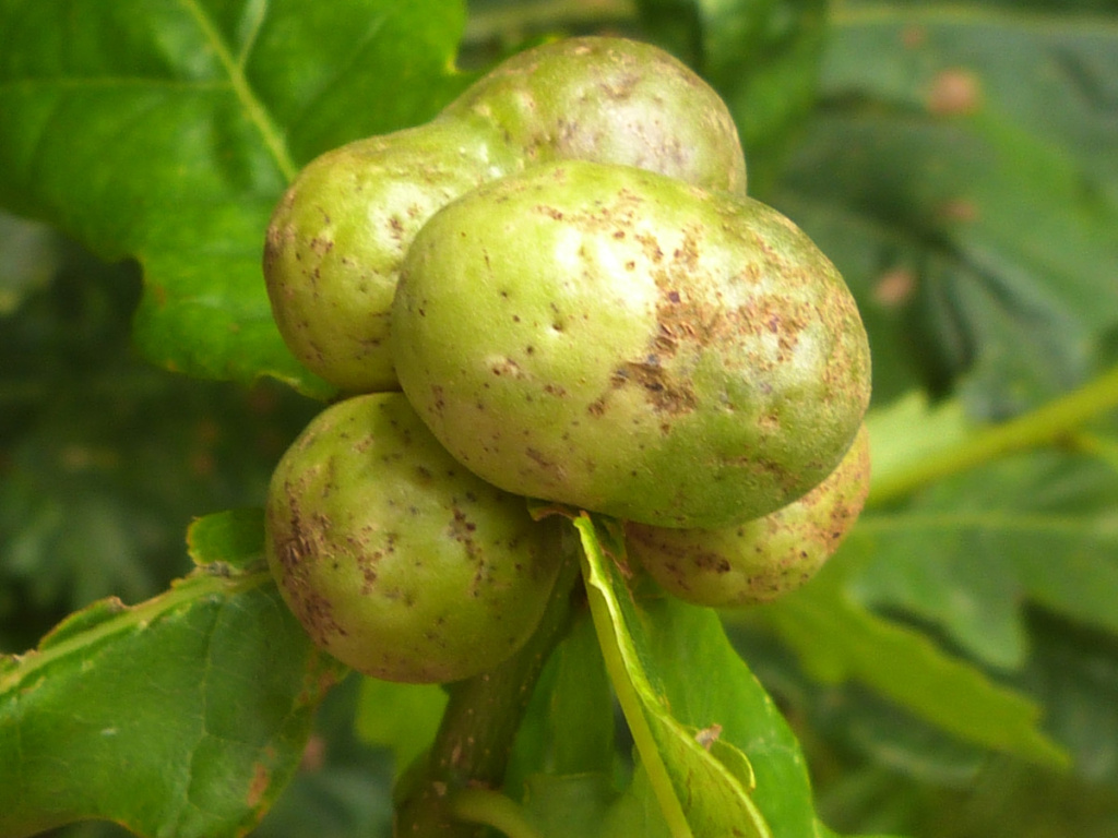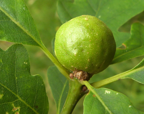 The agamic galls form on terminal and occasinally lateral buds of native oaks. They are large spherical galls that start green and become brown and very hard, often with small surface bumps. They can persist for several years. There is a single causer larval chamber inside, although inquilines are also common in the gall tissue.