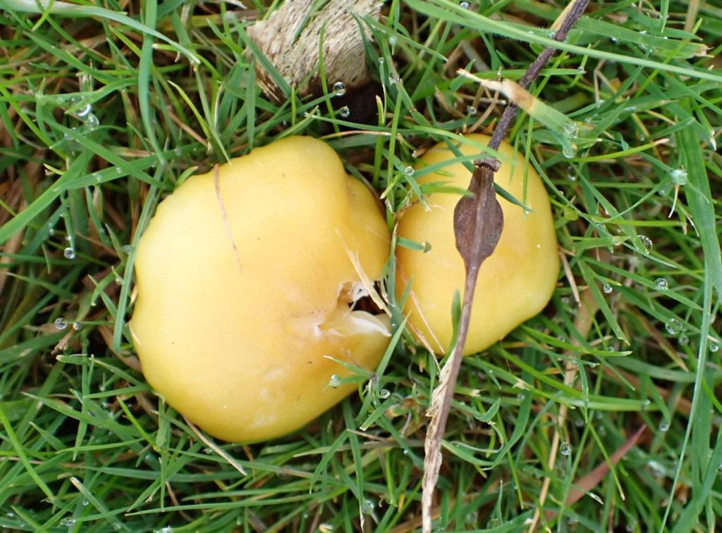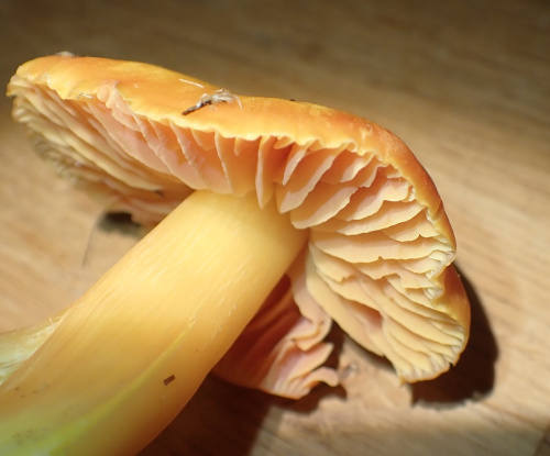 A very variable species. The gap is dry/slightly greasy, yellow but drying paler; mature specimens may have a greyish tinge to the cap. The stipe is yellow, often with an orange tinge especially to the top; gill attachment is variable, but the gills are usually yellow-orange with a pinkish tinge. The most distinctive feature is the unpleasant smell, descibed by some sources as like bed-bugs or wet laundry; by others like oily fish; best detected by crushing gills or placing in a sealed container for a while. Specimens are often larger than other yellow waxcaps, and crumble apart easily; the mature caps often split.