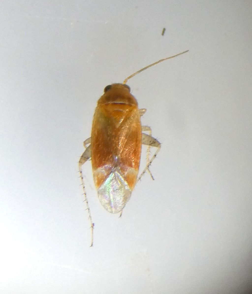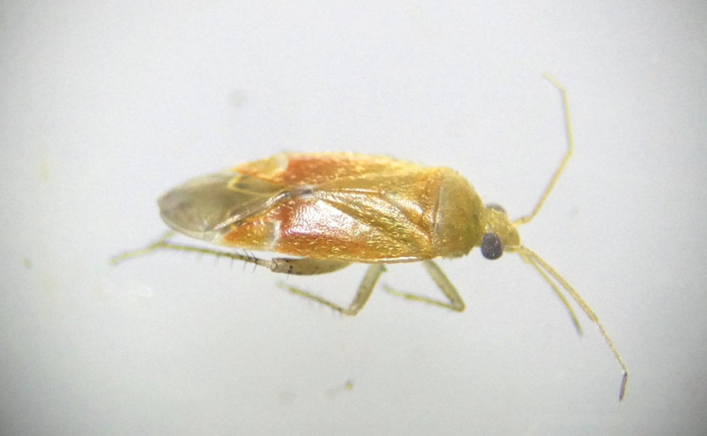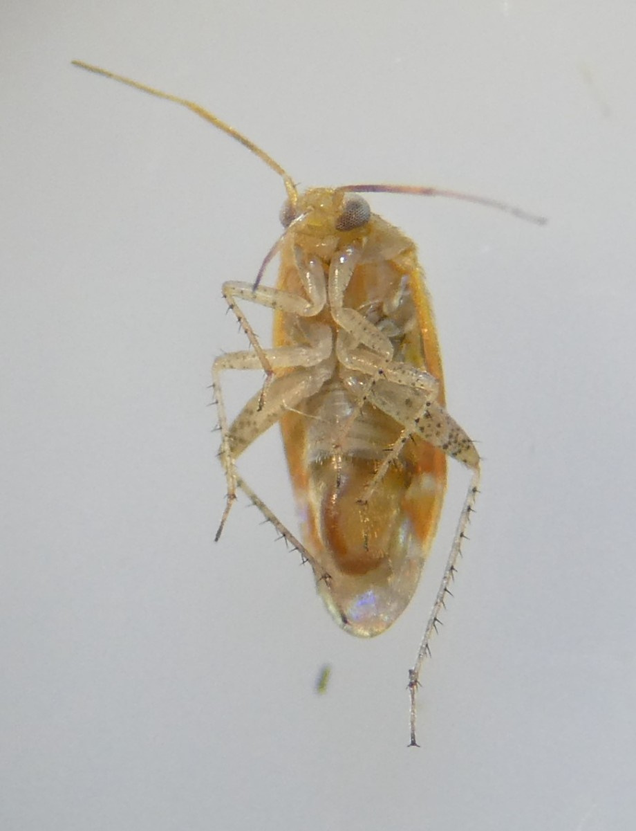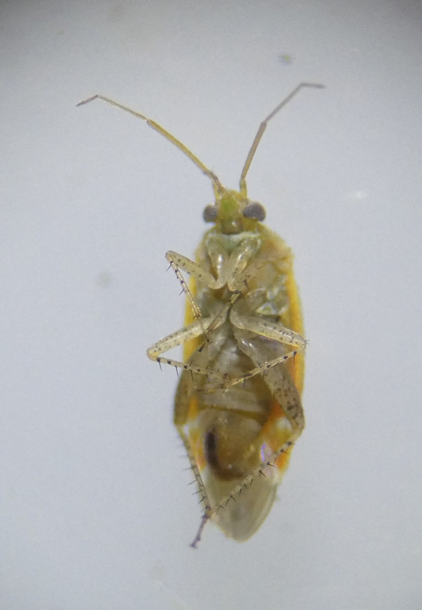 A small elongated bug associated with Turkey Oak. Males with yellow-orange head, pronotum and dorsal surface, usually shading to red-orange near cuneus; pale antennae and legs, and yellow/orange cuneus with pale base. Females are larger and paler - almost translucent.
