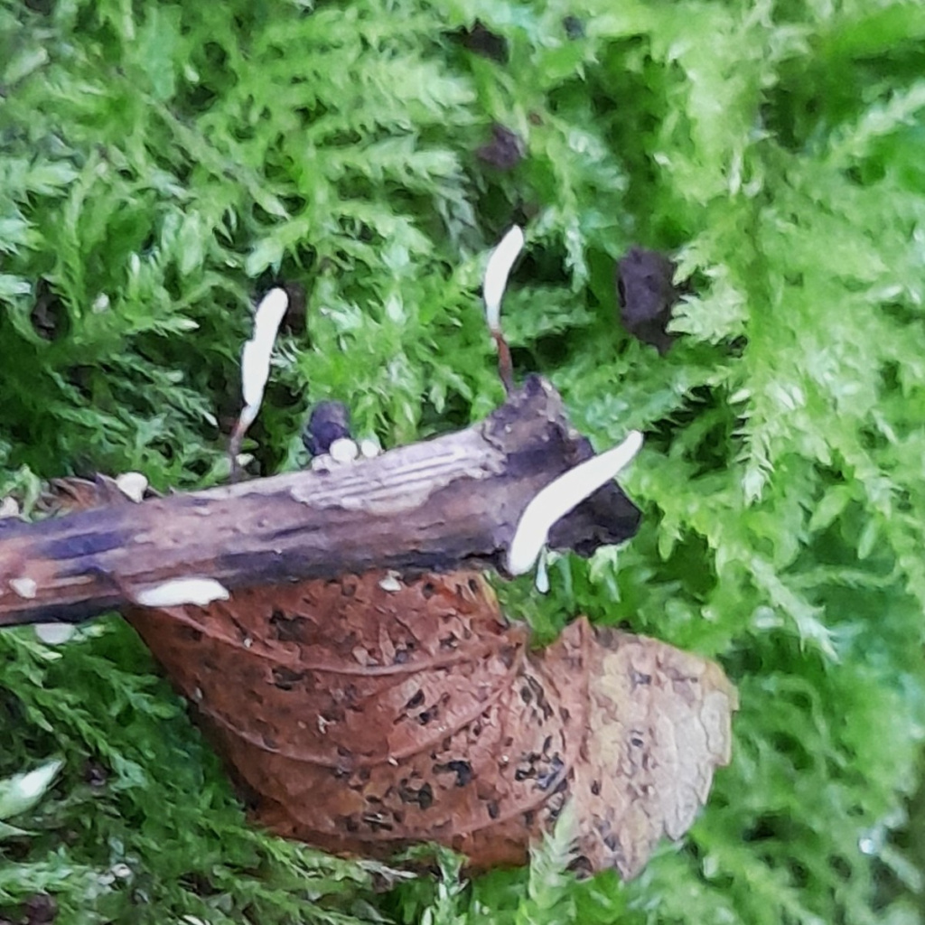 A small white club with a red-brown stem growing from a brown disc-like sclerotium on the petioles, midribs etc. of the leaves of various deciduous trees and shrubs. The stem is minutely hairy - use hand lens.