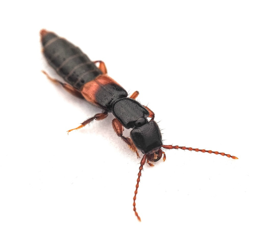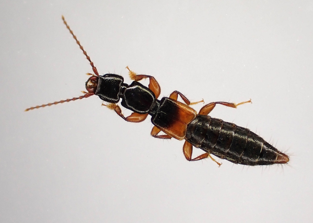 Length 7.5 to 10 mm. This rove beetle has quite a distinctive combination of bi-coloured elytra and a distinctively shaped thorax with very sharp anterior angles.