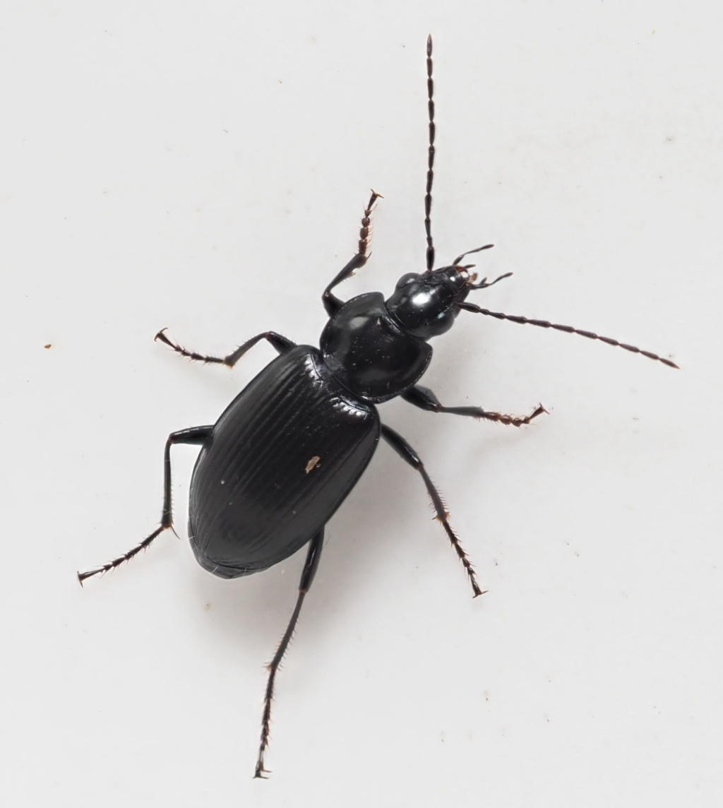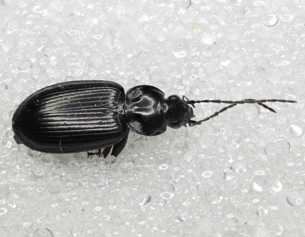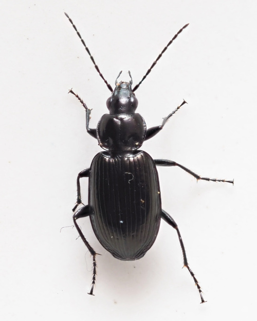 Length 7 to 9 mm. There are 15 British species of Agonum, mainly associated with damp habitats and all with rounded pronotum hind angles. Agonum emarginatum is all black, with just its tibiae and tarsi sometimes dark brown.