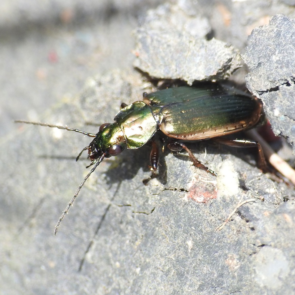 8.8 to 10.4mm. The overall colour of this medium-sized ground beetle is a coppery-green but the elytra have cream coloured margins. The antennae are dark apart from a paler brown first segment. The hind angles of the pronotum are strongly rounded.