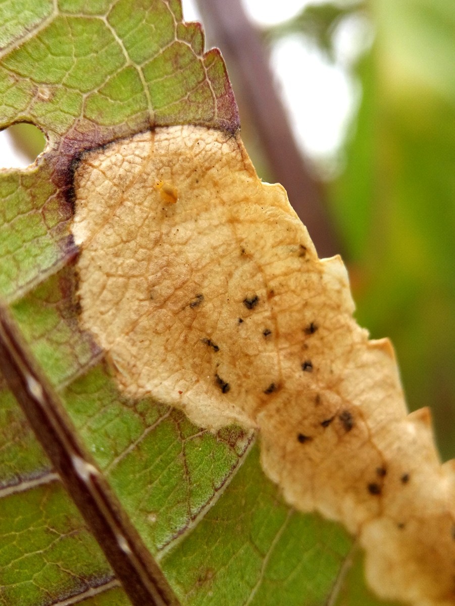 Provide backlit photographs of the whole leaf-mine in the leaf, and the larva, and note the host plant.