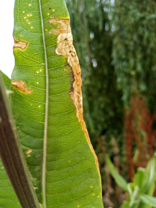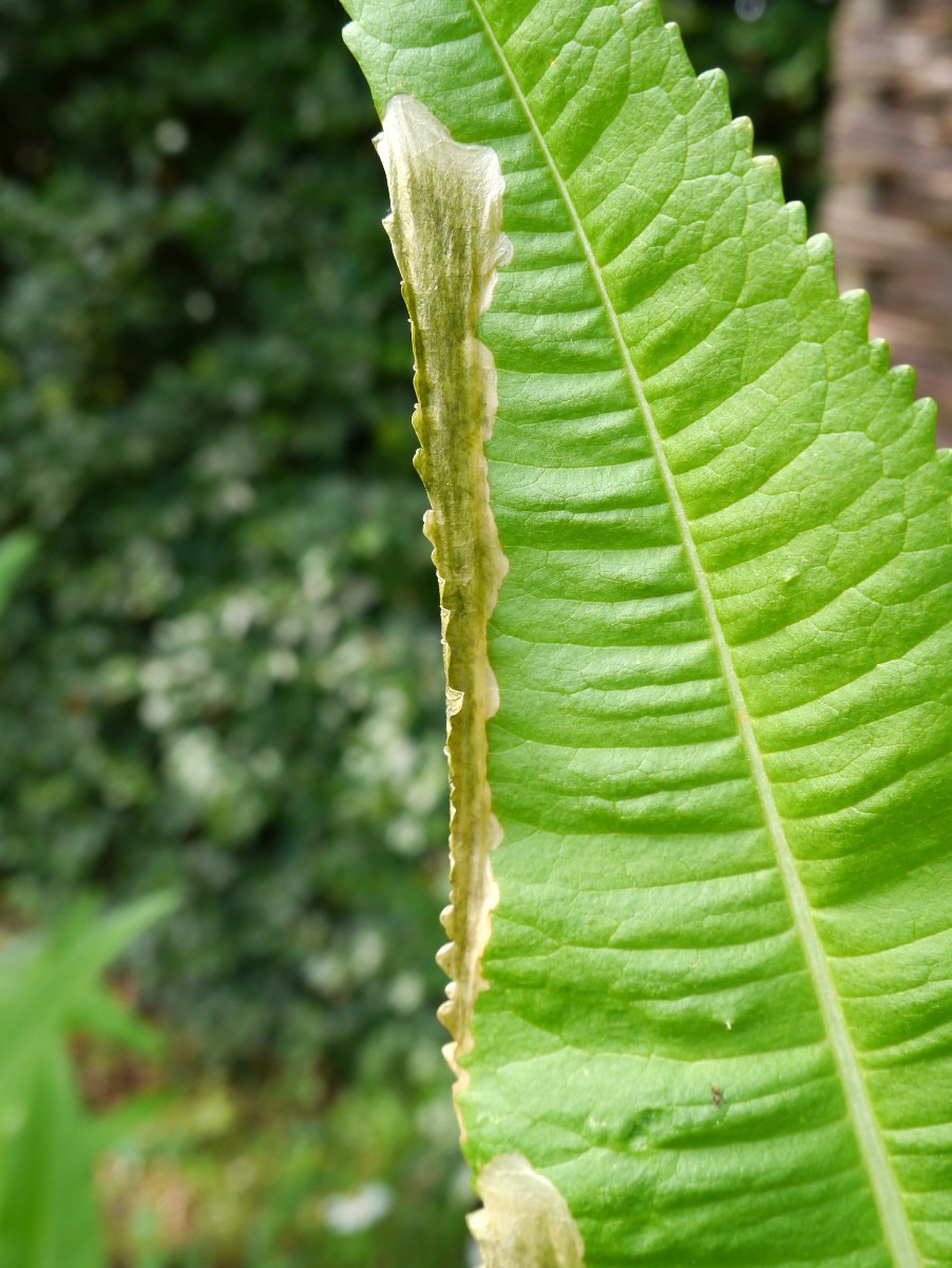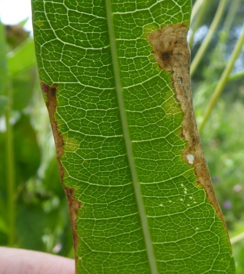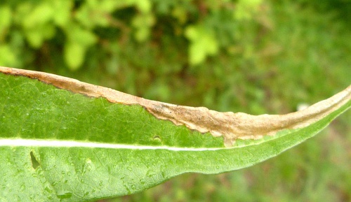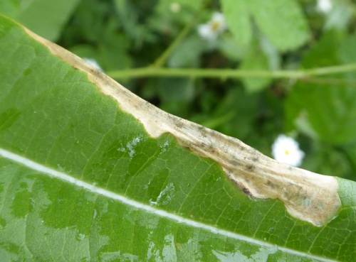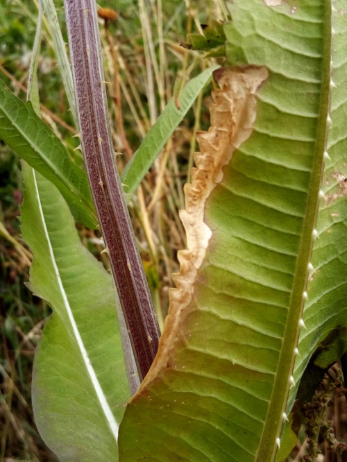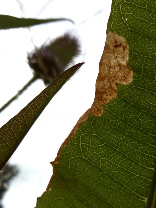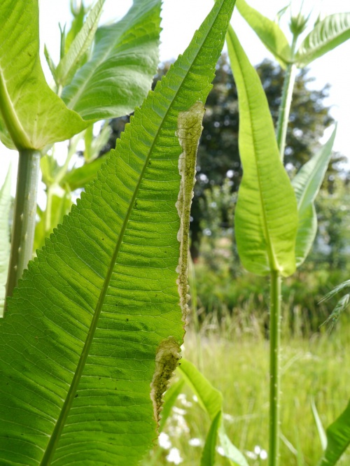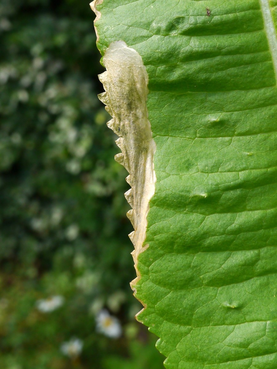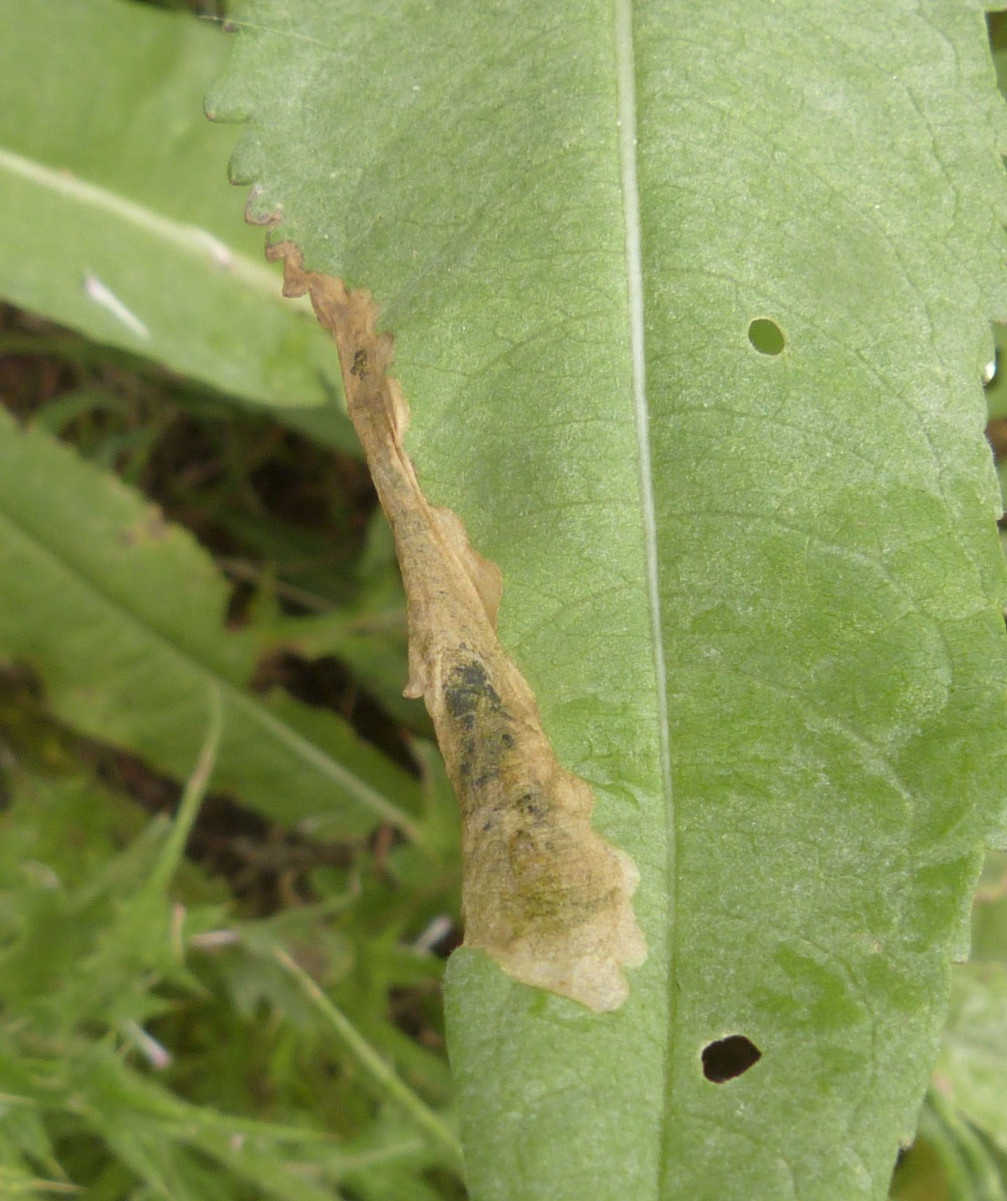 The larvae mine the leaves of Teasel. It produces a long mine, which rapidly broadens, at the leaf edge. The mine turns brown.