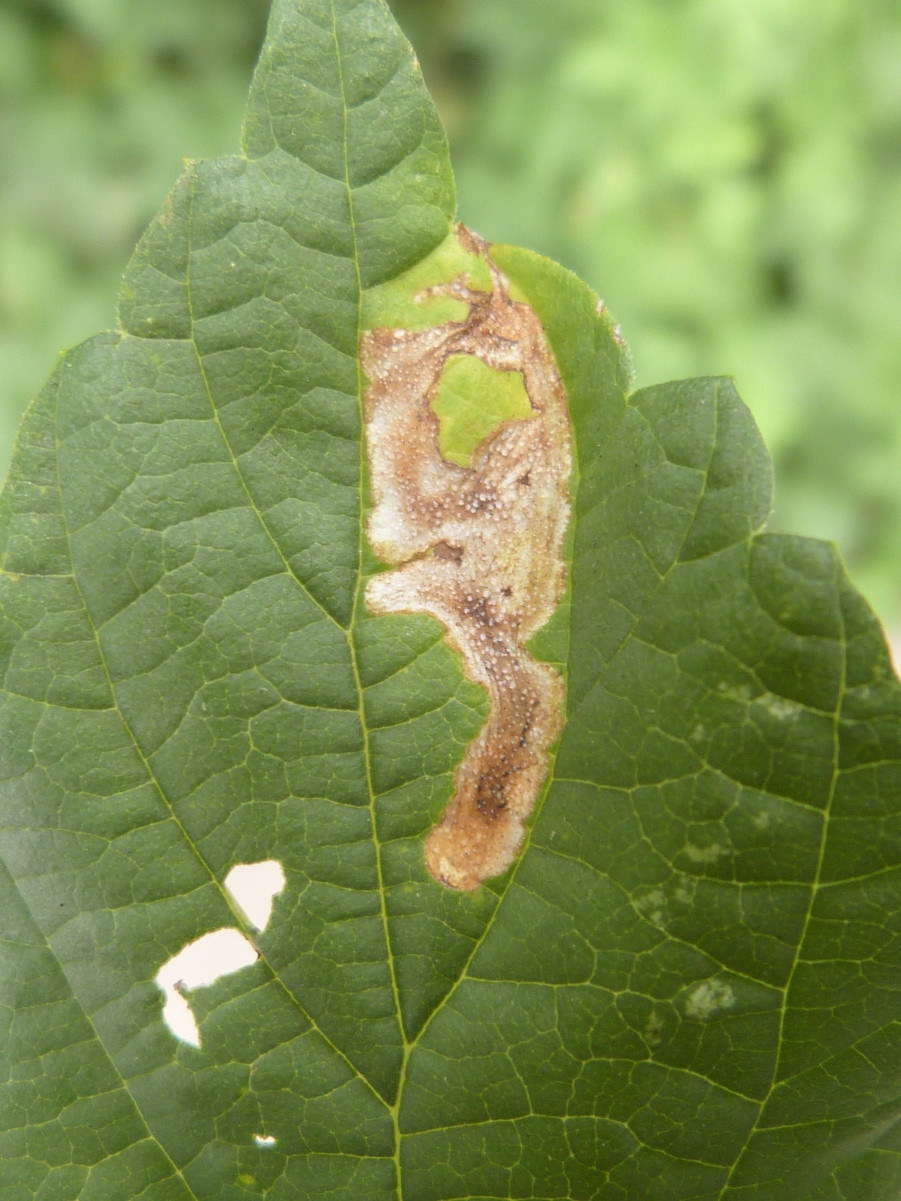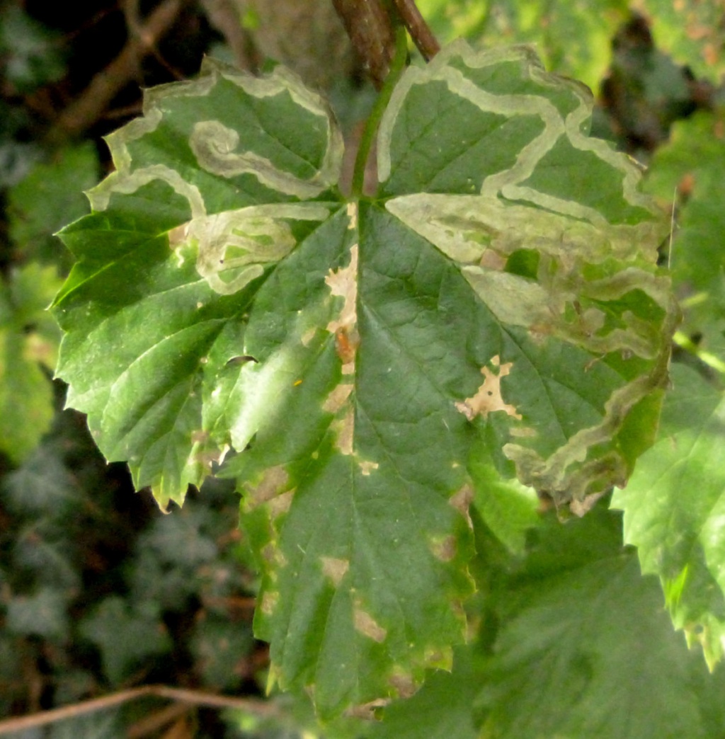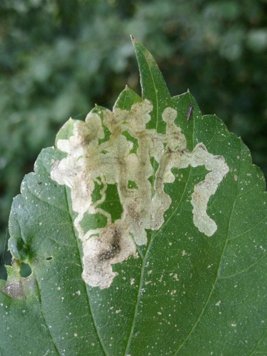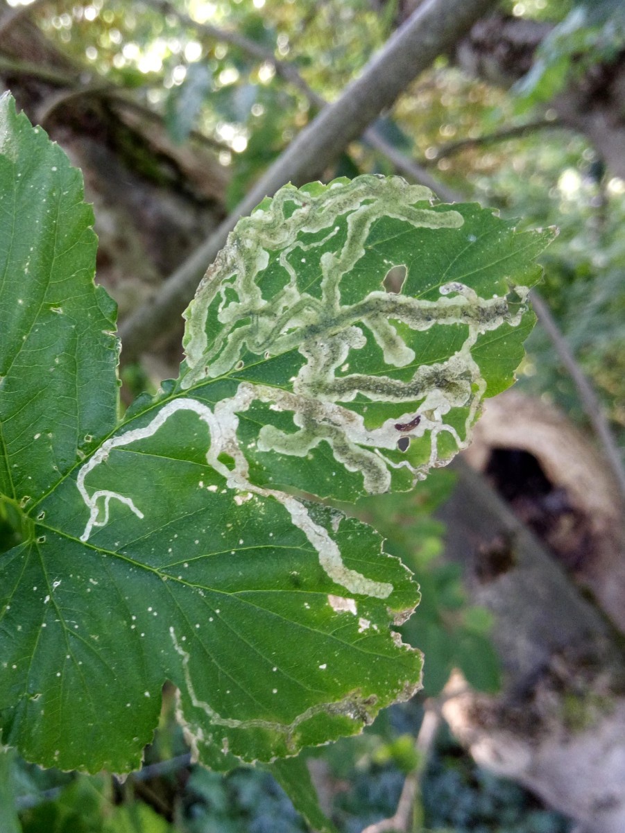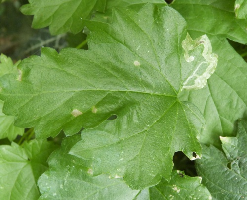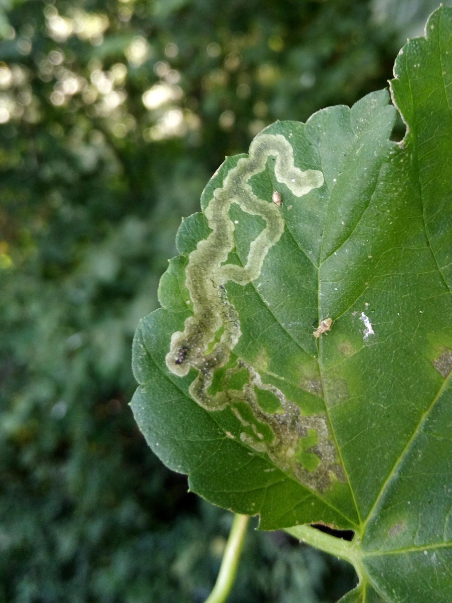 The larvae mine the leaves of Hop (Humulus lupulus) creating a long upper surface gallery widening towards the end and with greenish, diffused frass.