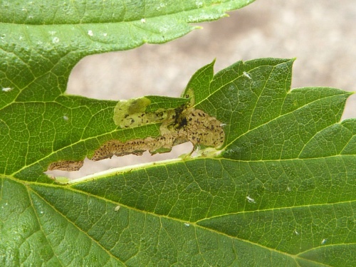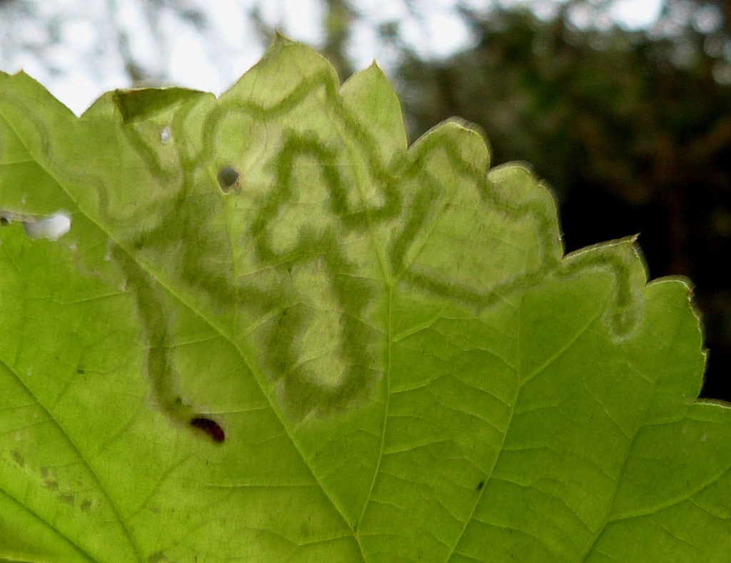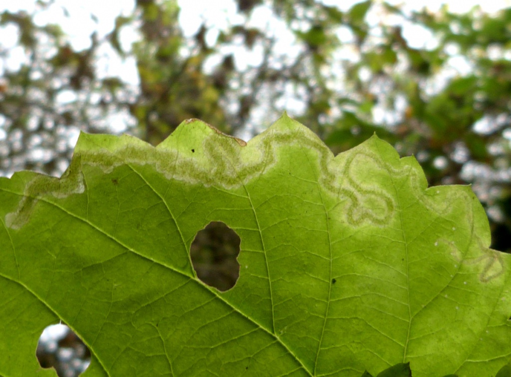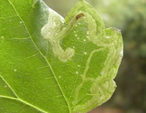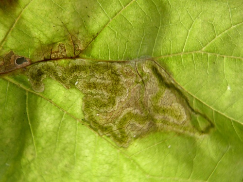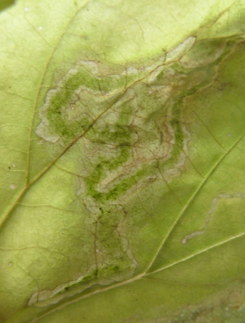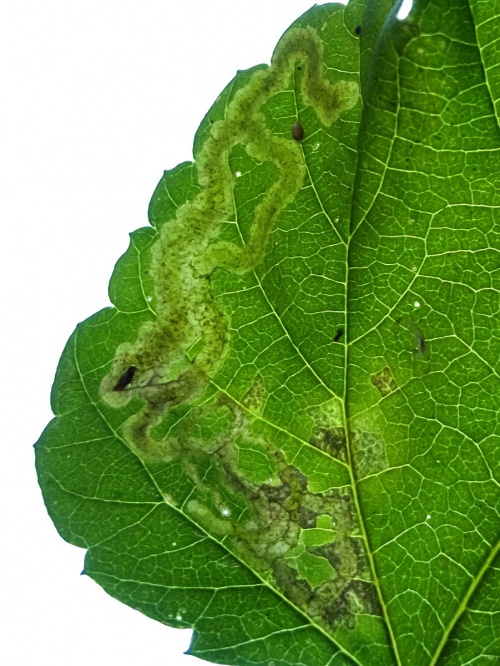 Provide backlit photographs of the whole leaf-mine in the leaf, and the larva, and note the host plant.