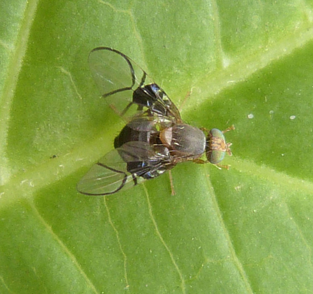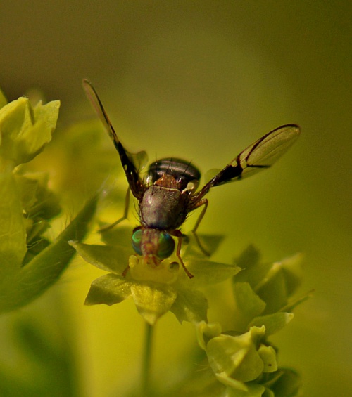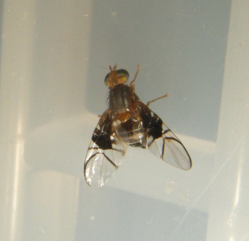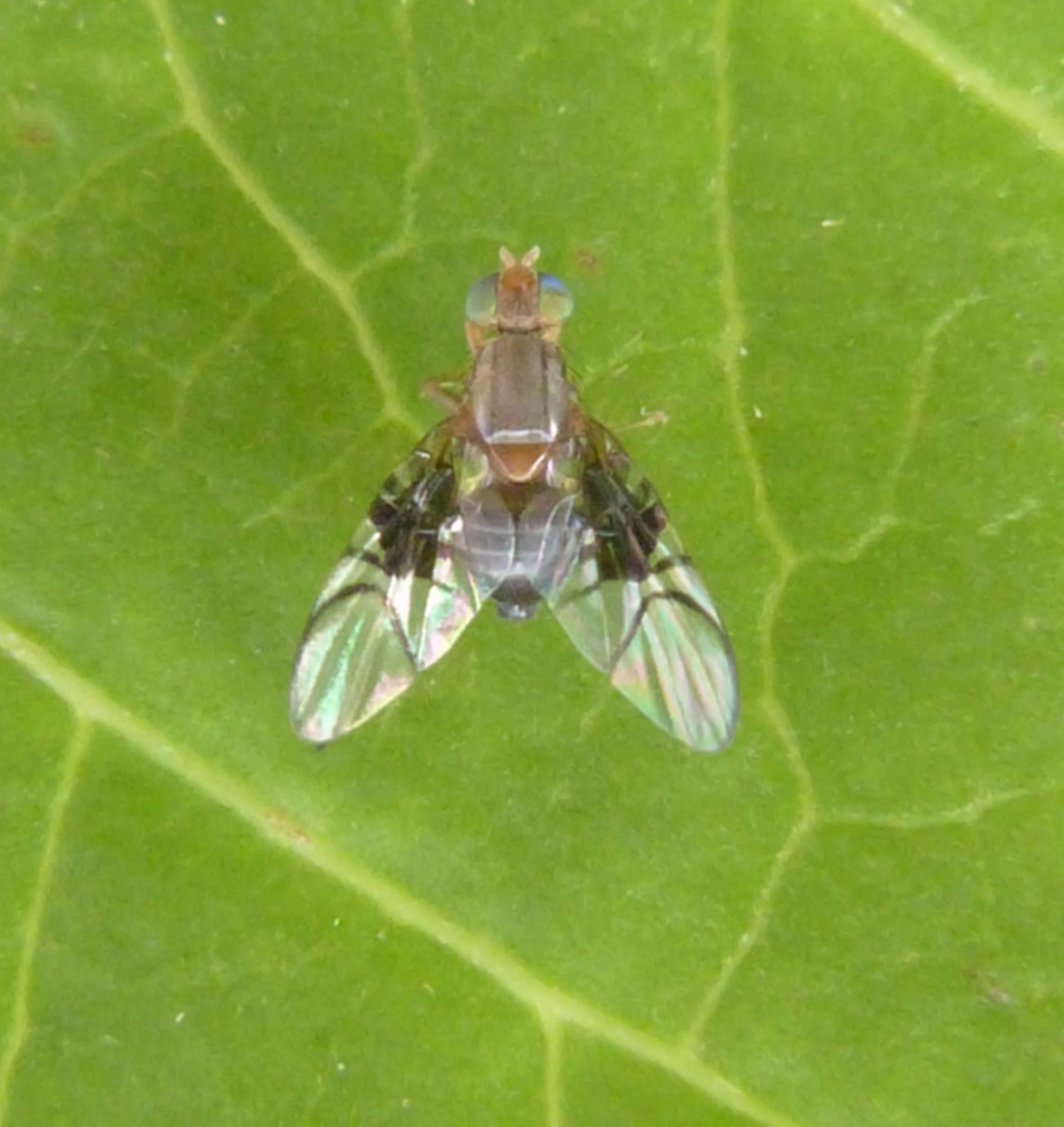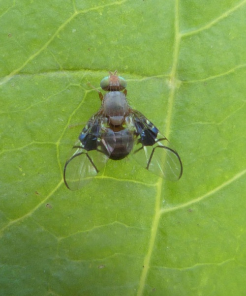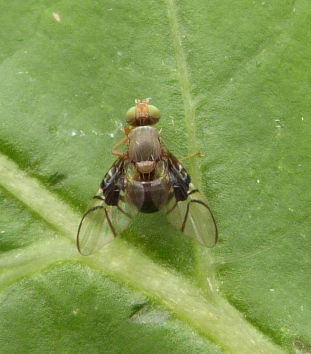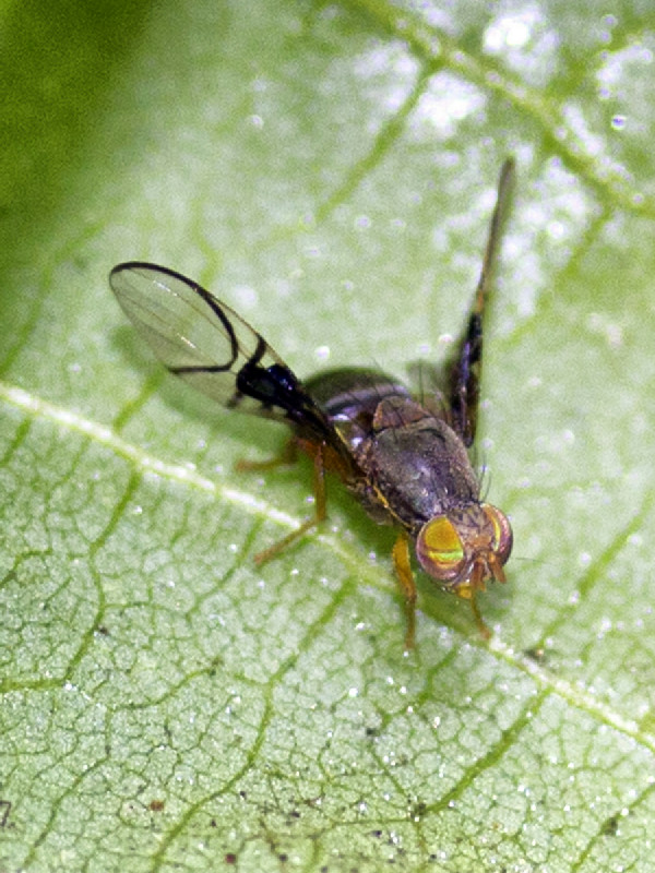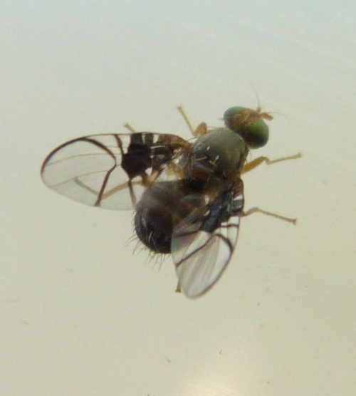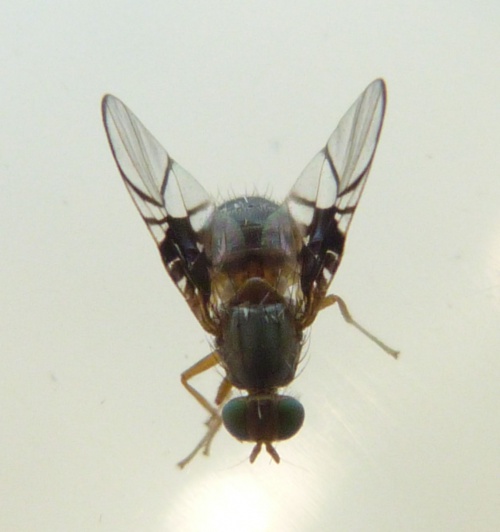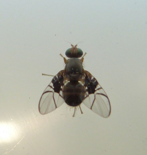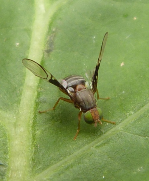 Length 4.5 mm. The wing markings are very characteristic and distinctive. The eyes are green with two transverse red bands. Wings are carried in a front facing posture. perhaps as an attempt to look bigger or fiercer than it really is.
