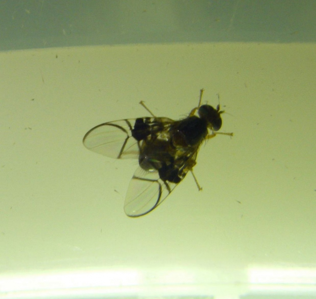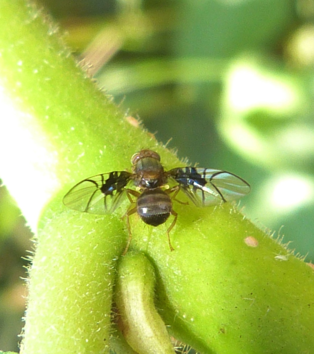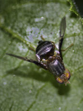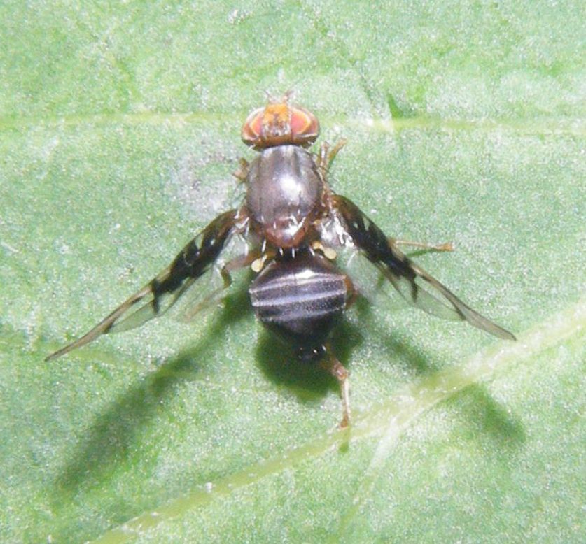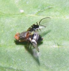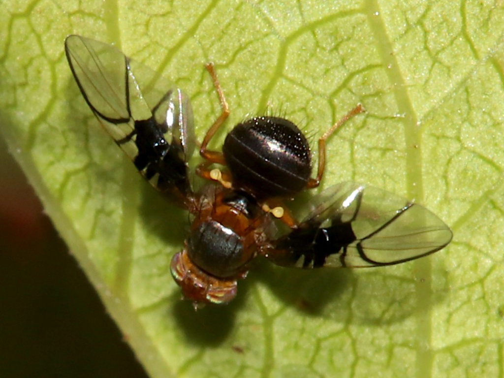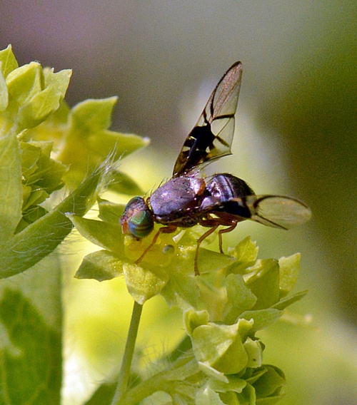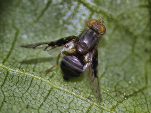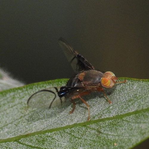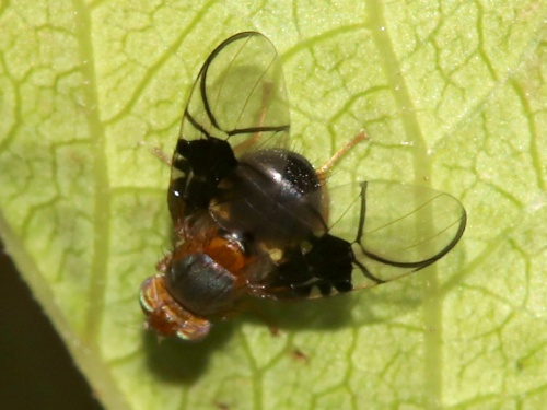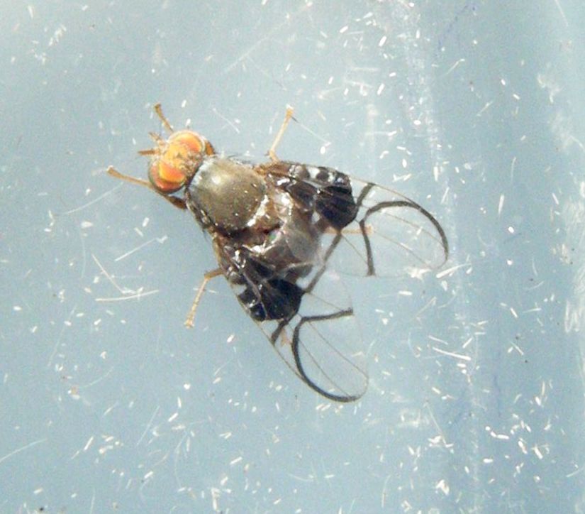 Length 4.5 mm. The wing markings are very characteristic and distinctive. The eyes are green with two transverse red bands. Wings are carried in a front facing posture. perhaps as an attempt to look bigger or fiercer than it really is.