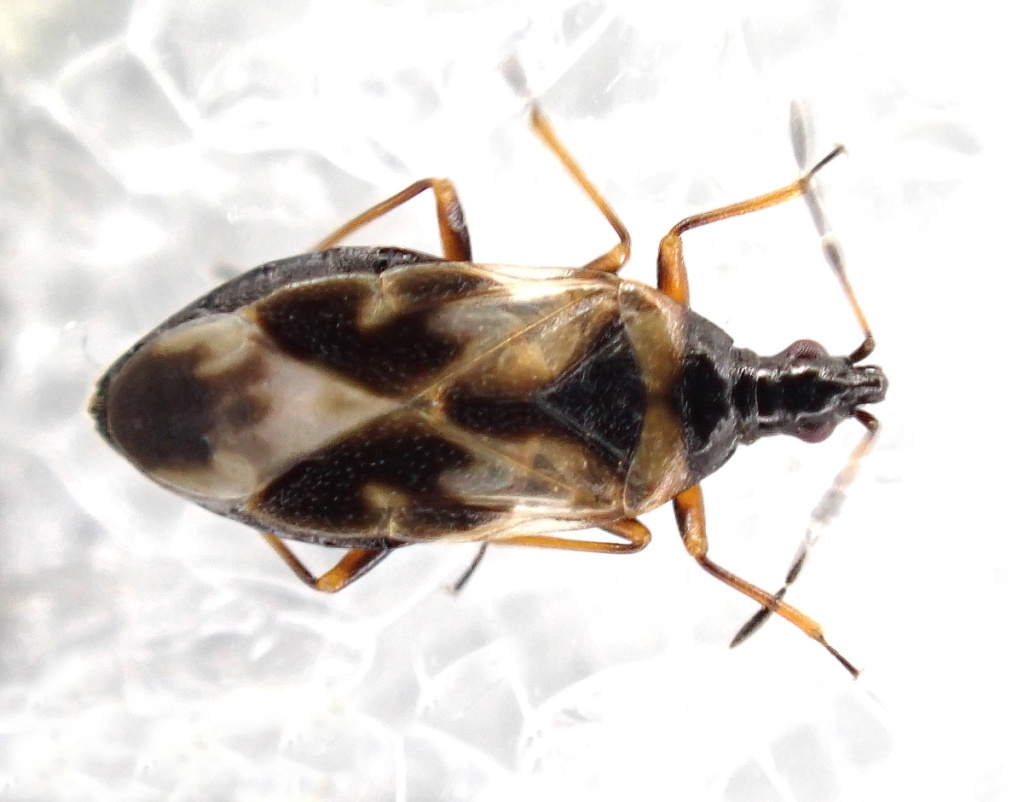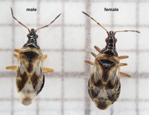 Length 3 to 3.5 mm. One of the easier flower bugs to identify. The antennae are relatively long and the forewings are entirely shiny, but unlike A. nemorum, the pronotum is clearly yellow/brown in the posterior half (A. nemorum may occasionally have reddish rear half of pronotum but not clearly defined). The forewings are generally lighter than in the more common species, and the membrane markings also typically different.