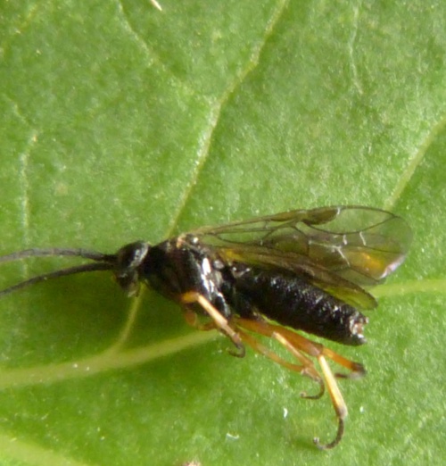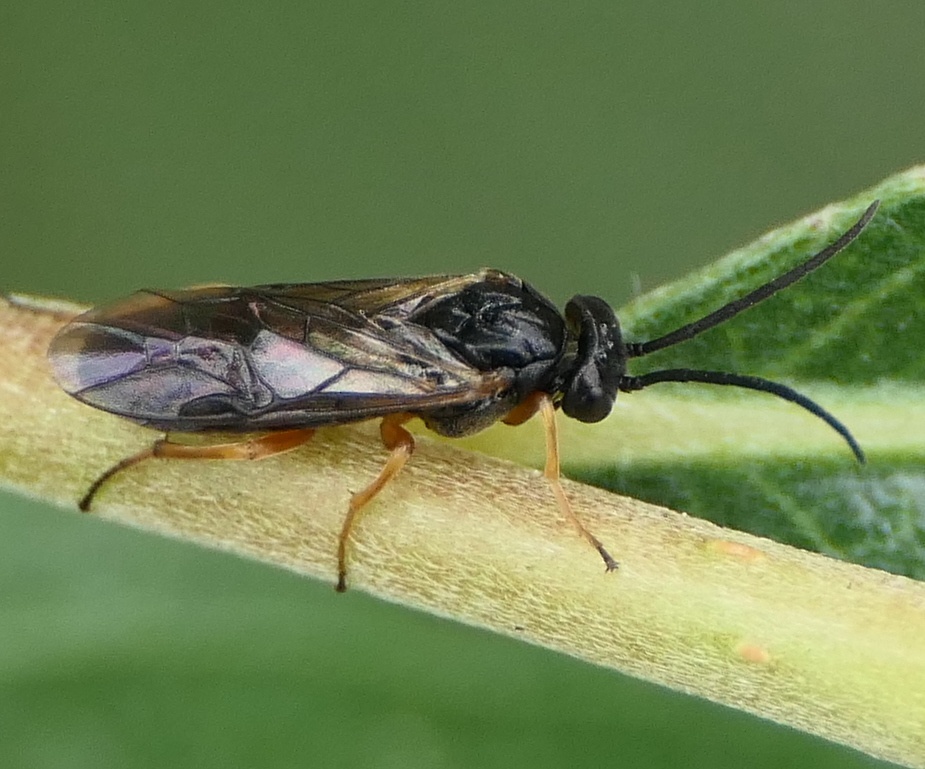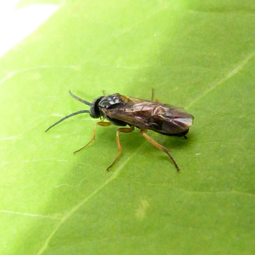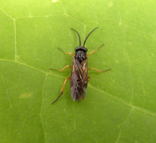 Pristiphora rufipes has a black abdomen and yellow legs. There are other similar species and detailed examination is necessary. It is associated with Aquilegia.