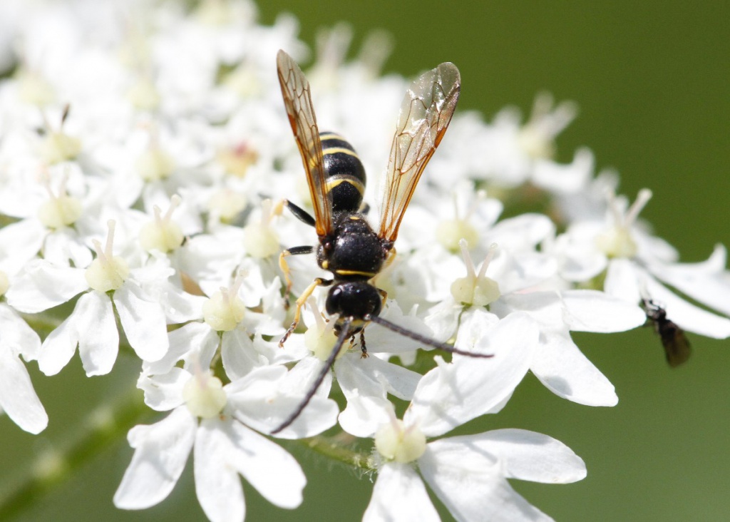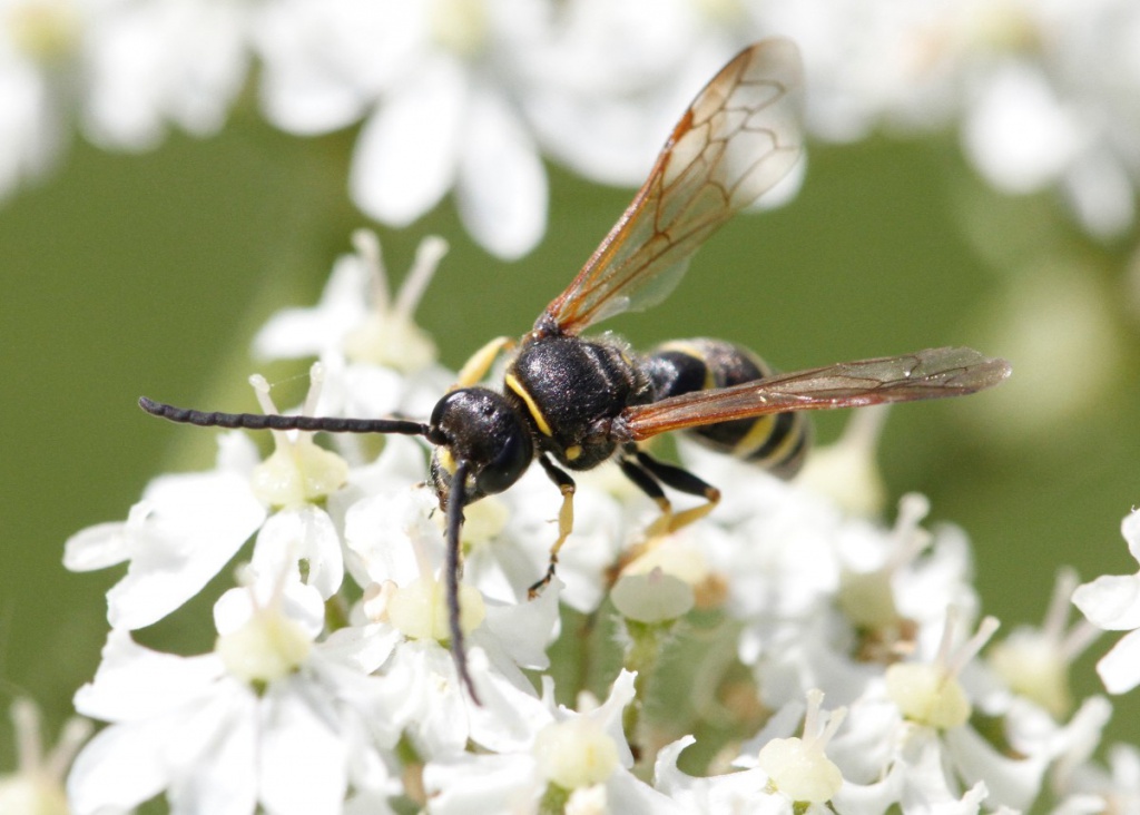 The scarcer and smaller of our two Argogorytes wasps, but seemingly with a similar biology to A. mystaceus. It is black and yellow banded and care is needed with identification due to similarity with other species.