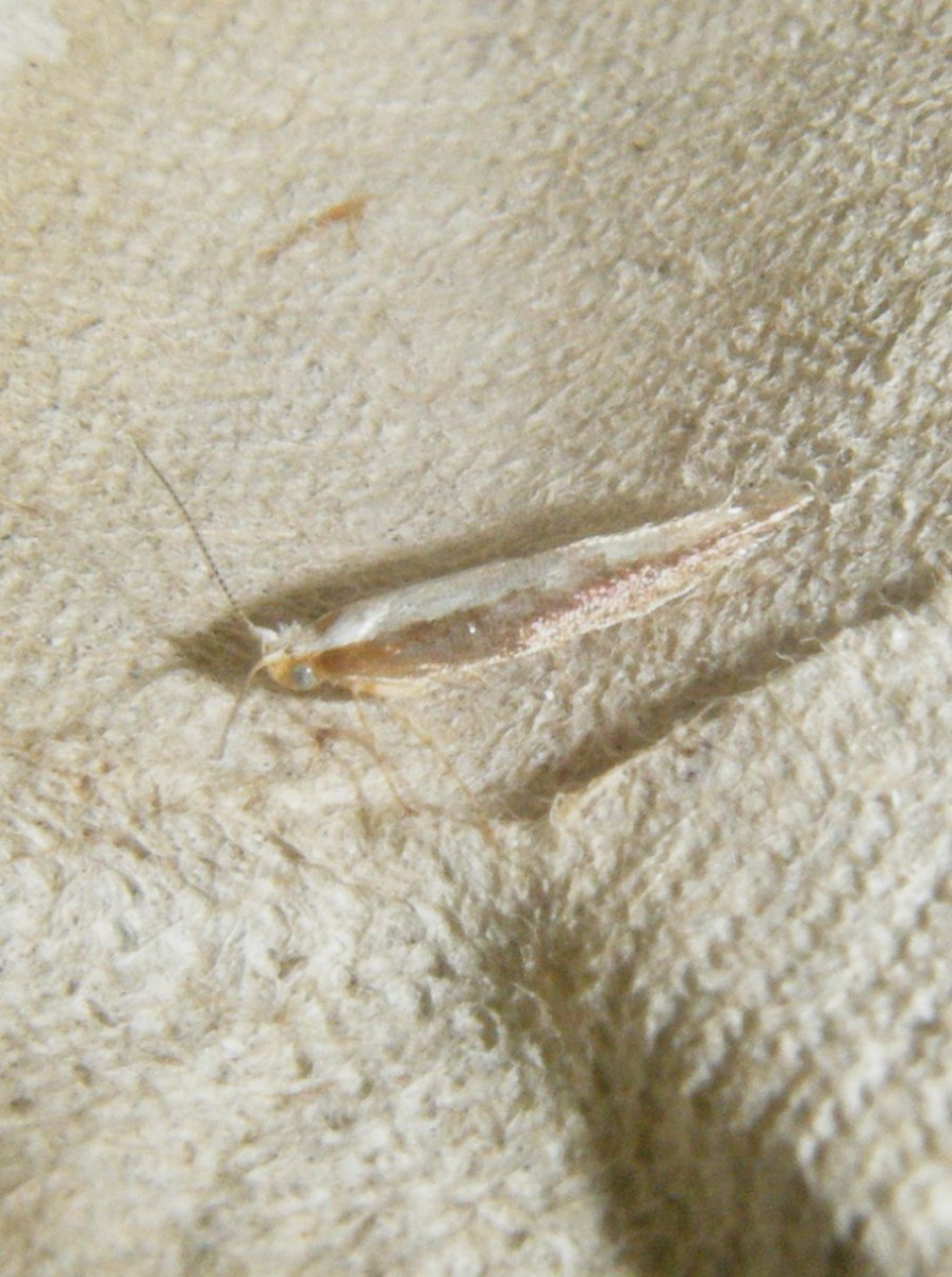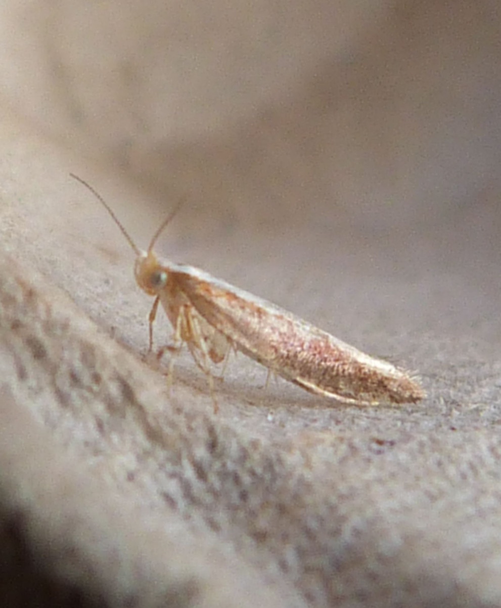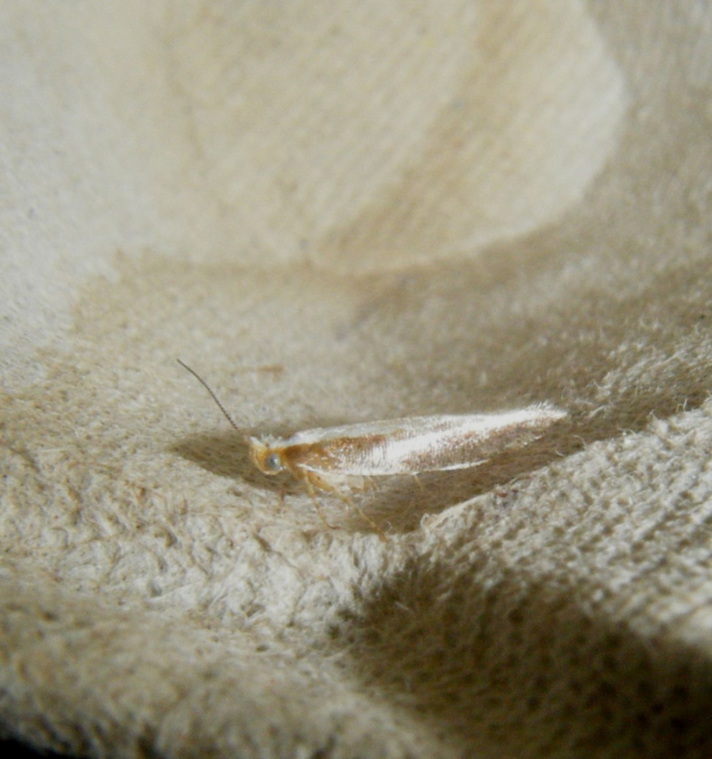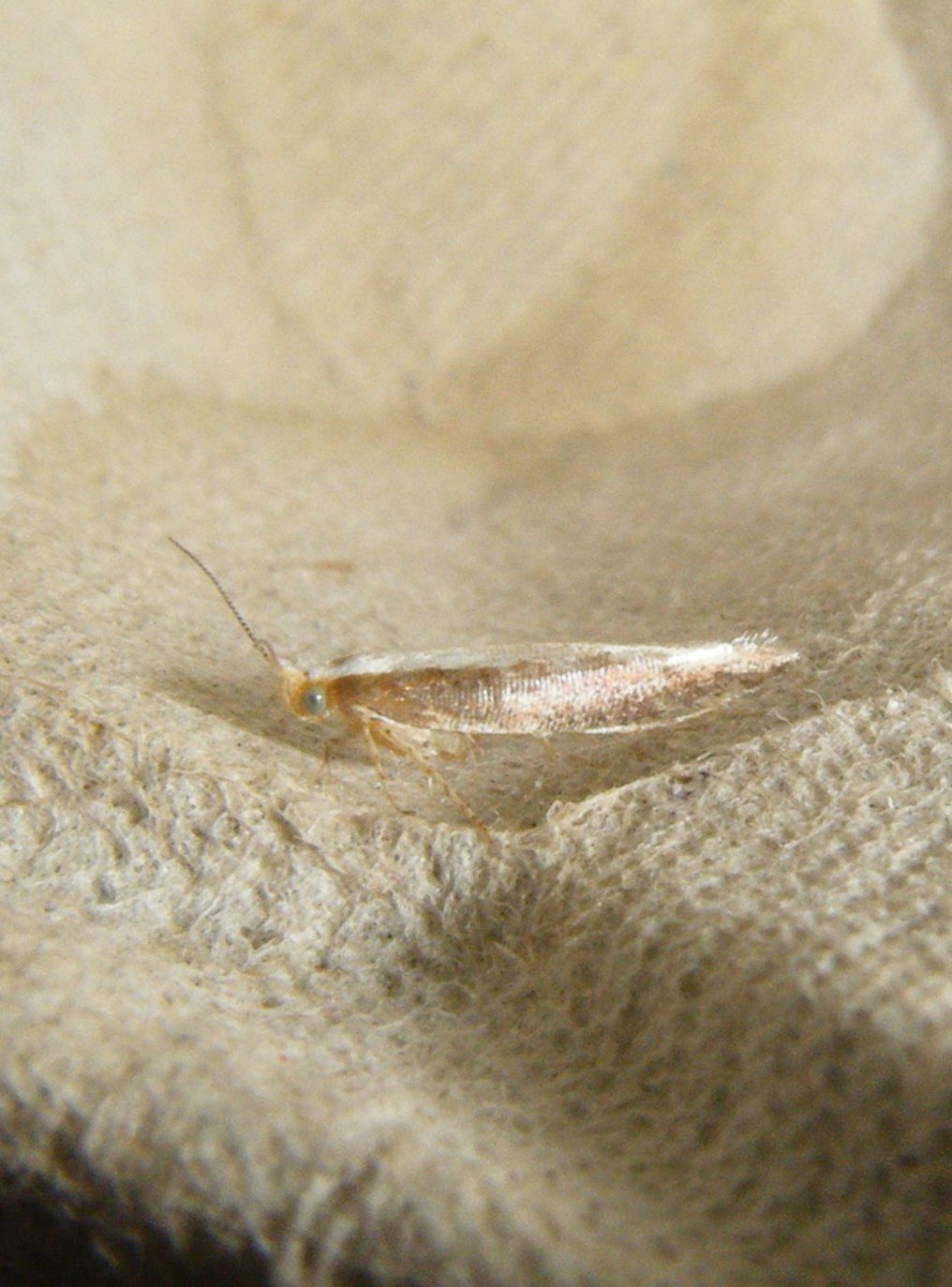 Wingspan 11 to 14mm. One of the larger of the Argyresthia species. It has a relatively plain golden brown forewing with a whitish dorsal streak extending for much of the forewing length.