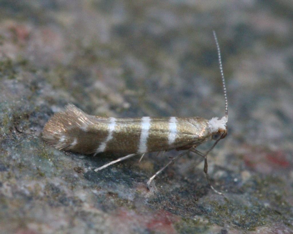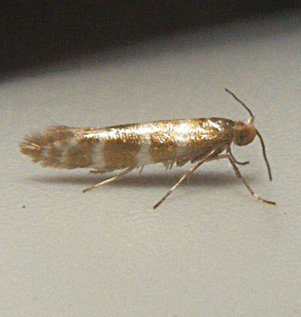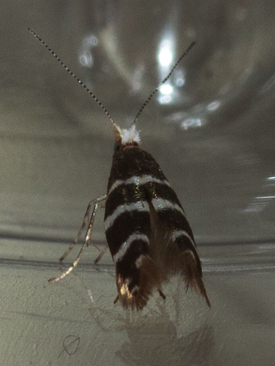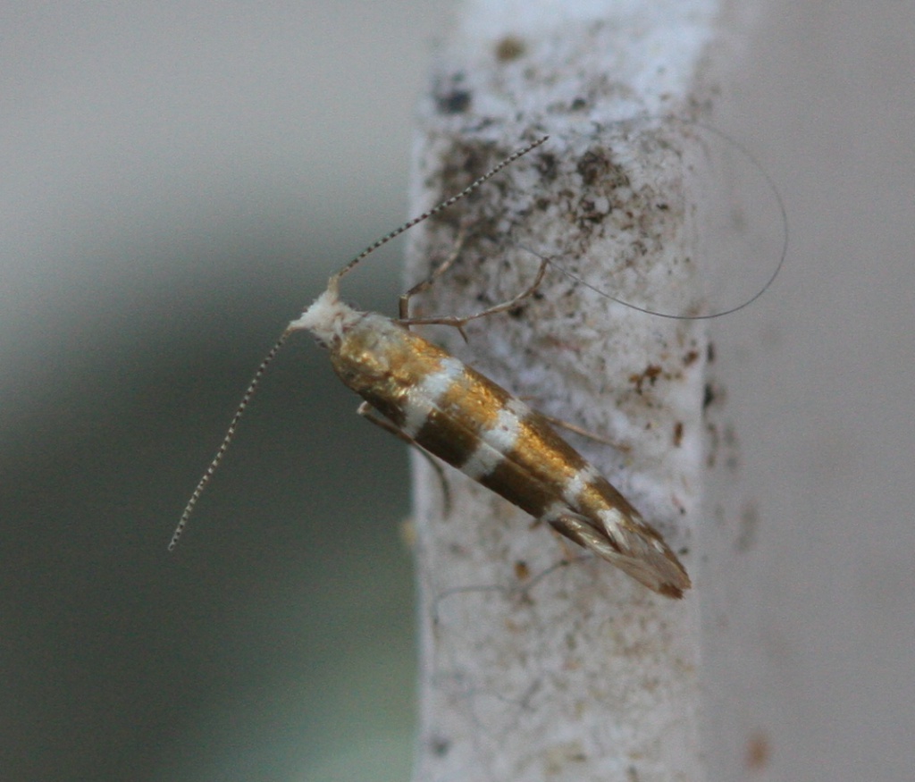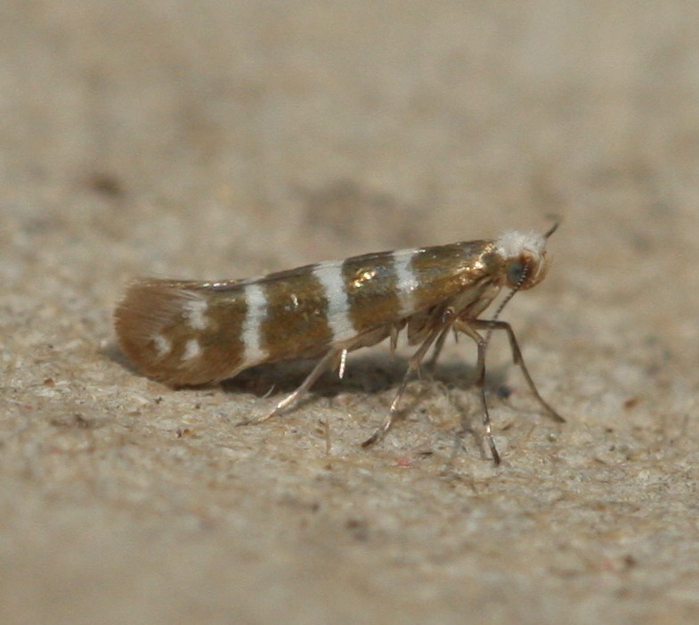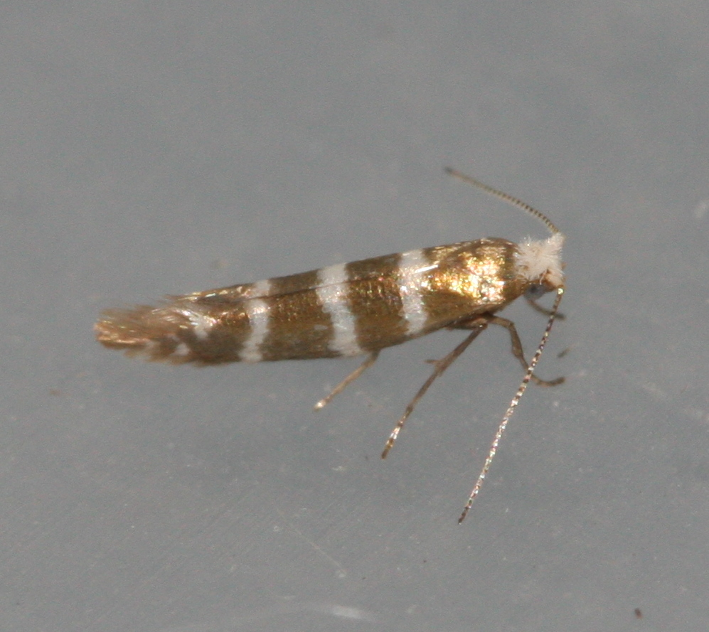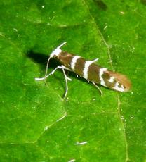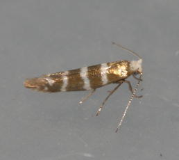 Tiny (6-8 mm wingspan) but quite distinctive with three white hoops around a golden background. It also has a white head. The larva mines the scale leaves of various trees in the Cypress family, entering each leaf through a hole. The mined leaves then turn brown and drop off