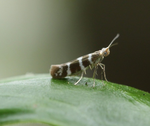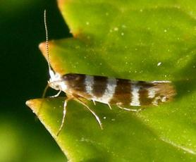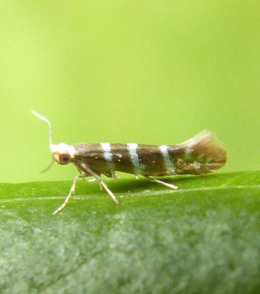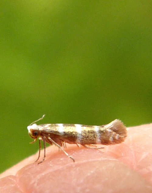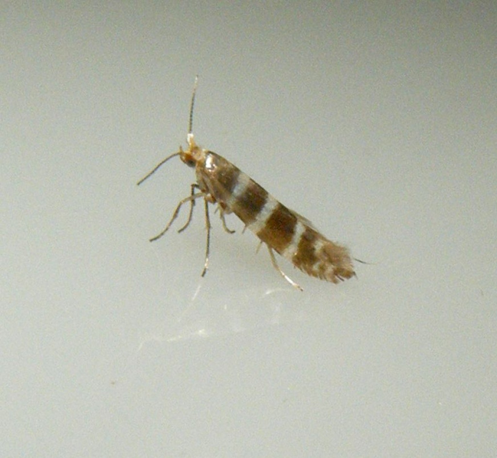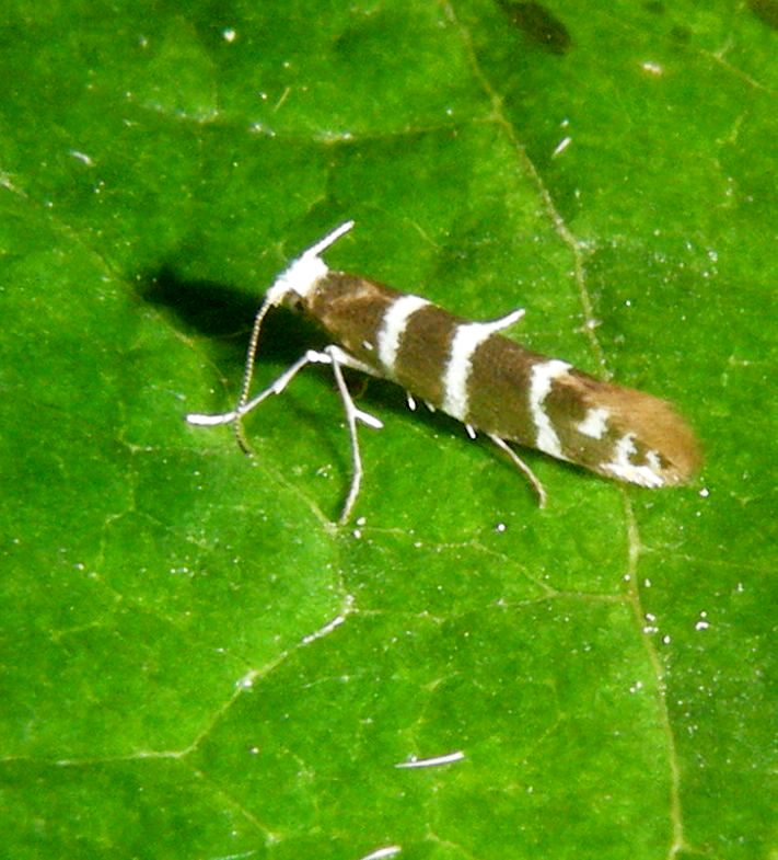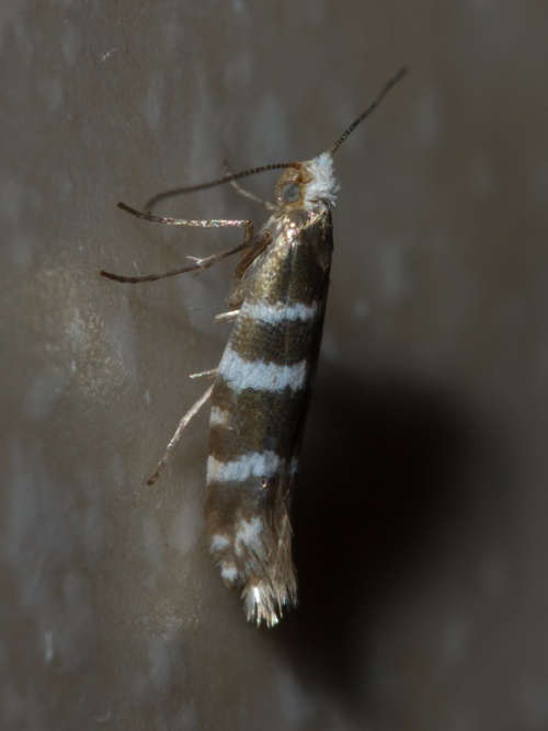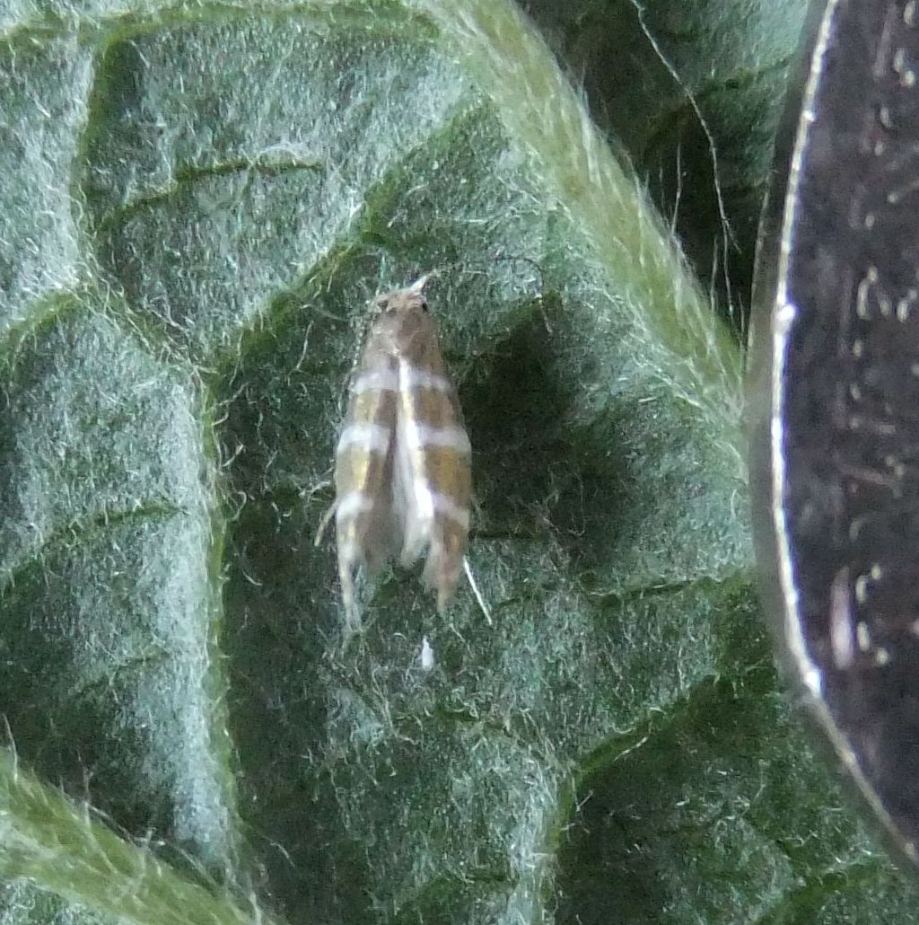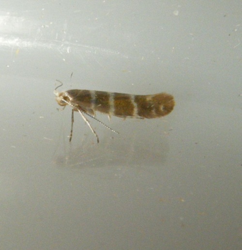 Tiny (6-8 mm wingspan) but quite distinctive with three white hoops around a golden background. It also has a white head. The larva mines the scale leaves of various trees in the Cypress family, entering each leaf through a hole. The mined leaves then turn brown and drop off