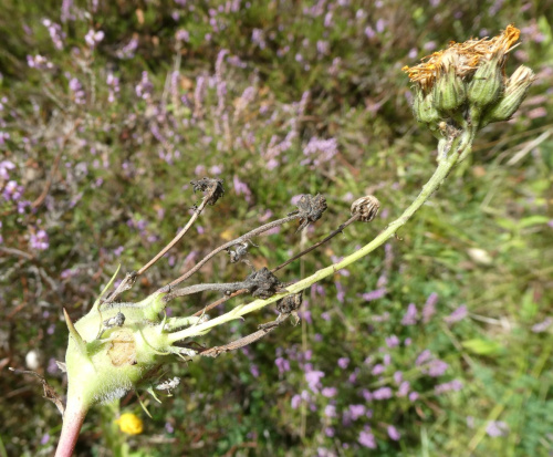 The larvae of the Cynipid gall wasp Aulacidea hieracii gall the stems of Hieracium species. The galls are rounded swellings up to 4 cm long. The part of the plant above the gall is usually strongly suppressed. The gall may be smooth, but can also be covered by erect white hairs, it is green and succulent at first becoming hard and brown later. Each gall contains several chambers each containing a whitish larva or a pupa.