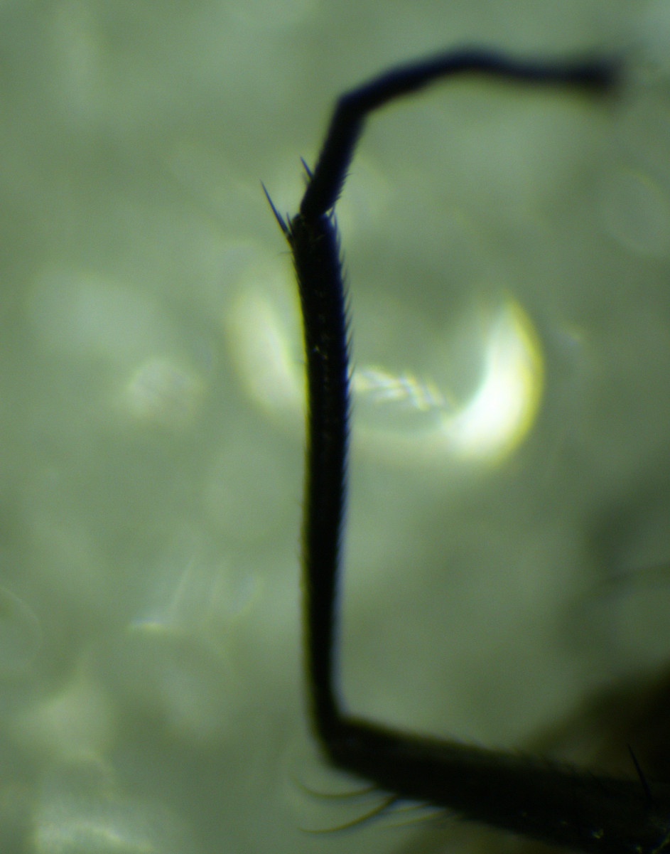 It has a distinct pre-apical bristle on the mid tibia but is lacking another bristle in the middle of the tibia.
