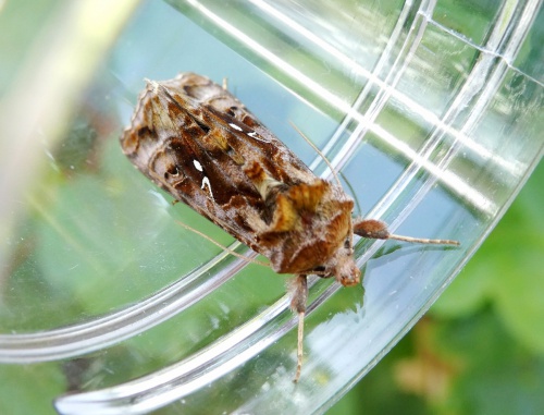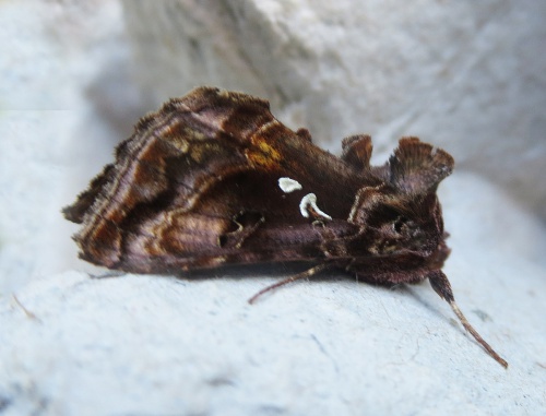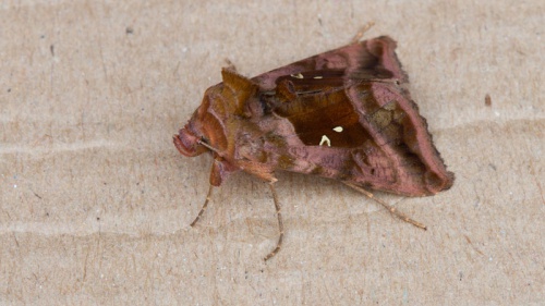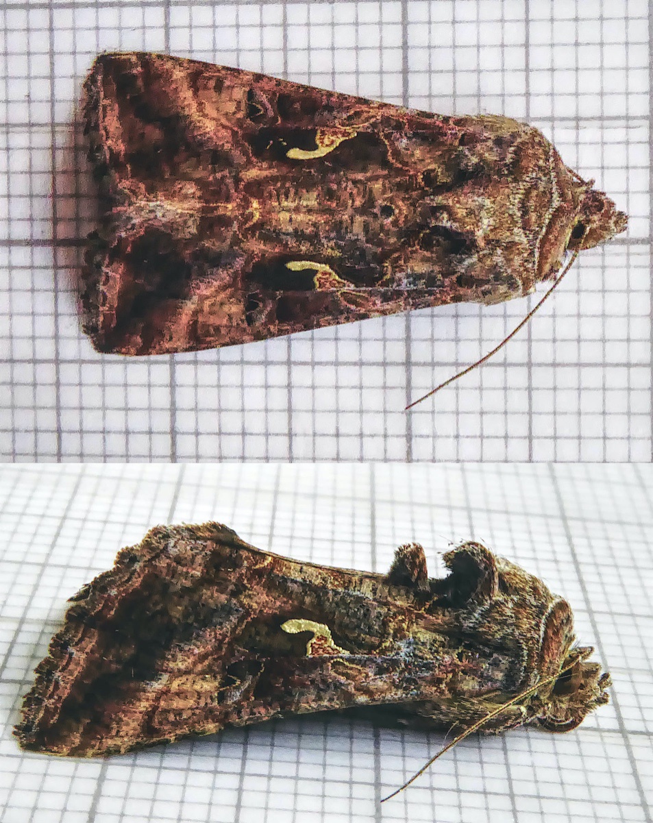 Wingspan 35-40 mm. Similar to the plain Golden 'Y', but with richer maroon colouring in the wings.