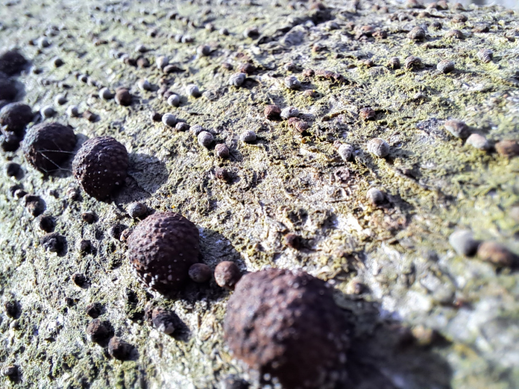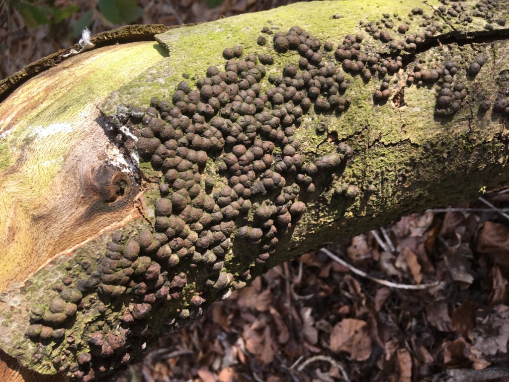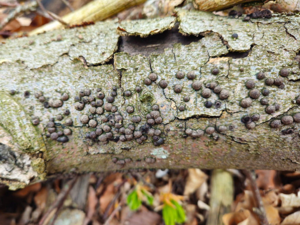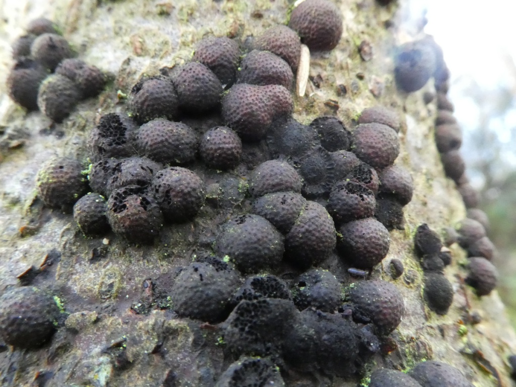The Beech Barkspot Diatrype disciformis has small erumpent black warts on beech; these have tiny pores but do not have a bumpy surface. Similar woodwarts or barkspots are found on other deciduous trees.