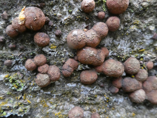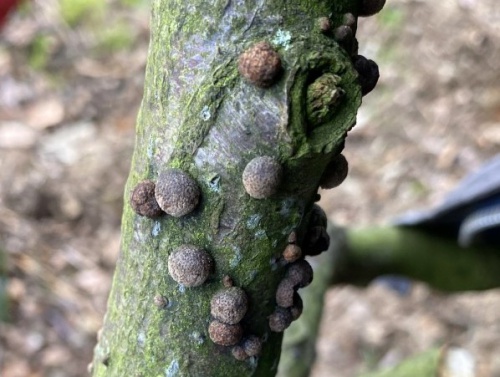 The rounded stroma or communal fruitbodies on the bark of Beech trees are initially pinkish-brown or orange-brown; later becoming darker brown then black. The surface is bumpy with the developing perithecia inside the stroma, and there are small small ostioles on the surface through which the spores are eventually ejected.