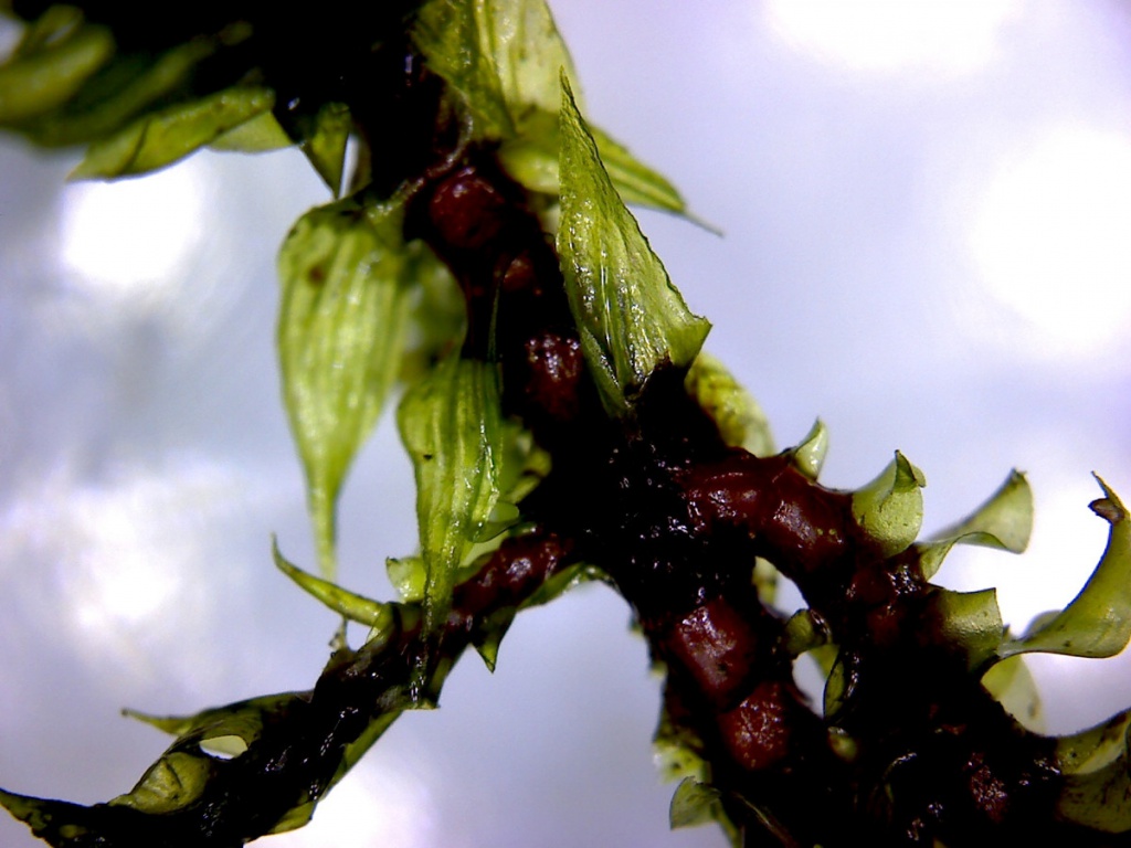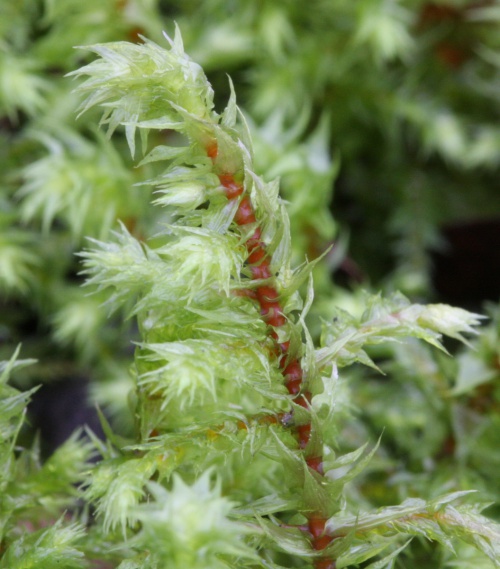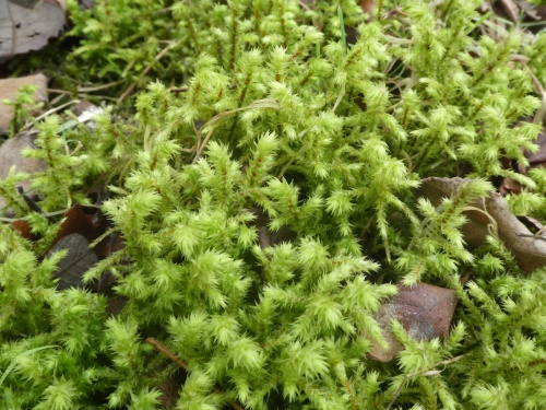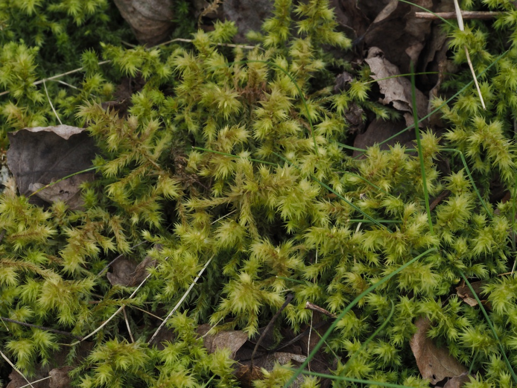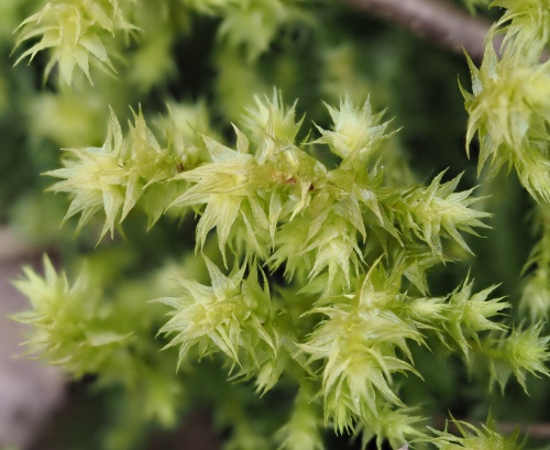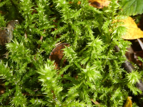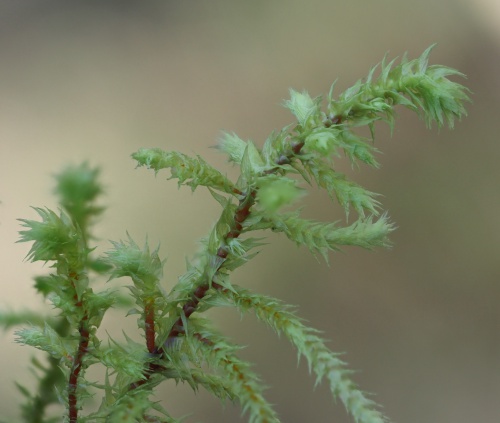 H. triquetrus is a very large, bushy moss that forms shoots from 5 to 15 or even 20 cm long, with irregularly branched, red stems. Whether wet or dry, the leaves stick out in all directions (unlike Rhytidiadelphus loreus). The leaves, which can be up to 6 mm long, are straight and have a pale, chaffy appearance, giving the shoot a unique, rather untidy character. The leaf has a double nerve, which extends about halfway up the blade and the margins are lightly toothed. Capsules are rare to occasional.
