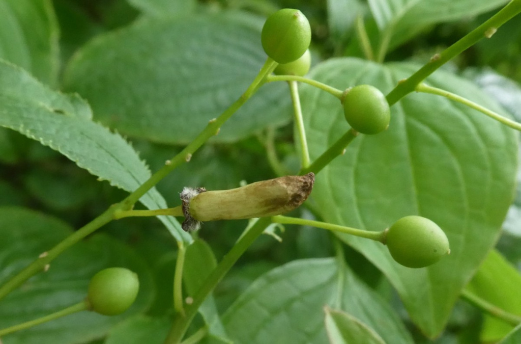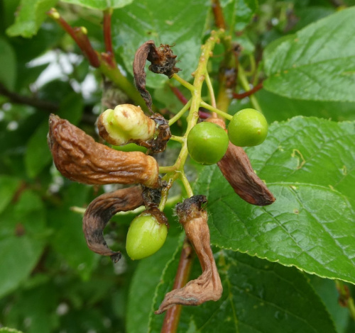 The Bird Cherry Pocket fungus Taphrina padi produces galls on Bird Cherry (Prunus padi), these take the form of distorted, swollen fruits that become hollow, curved and greatly elongated, without a seed or stone. They retain a persistent style.