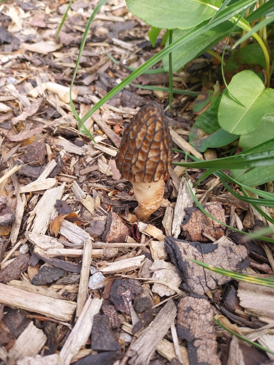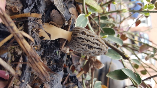 Morchella esculenta, the Common Morel, has a more rounded head with an irregular honeycomb of pits, not aligned in parallel ridges. The head of the Semifree Morel Morchella semilibera is attached to the stem only in the upper part. Morels in other genus do not have a single central hollow in stem and head.