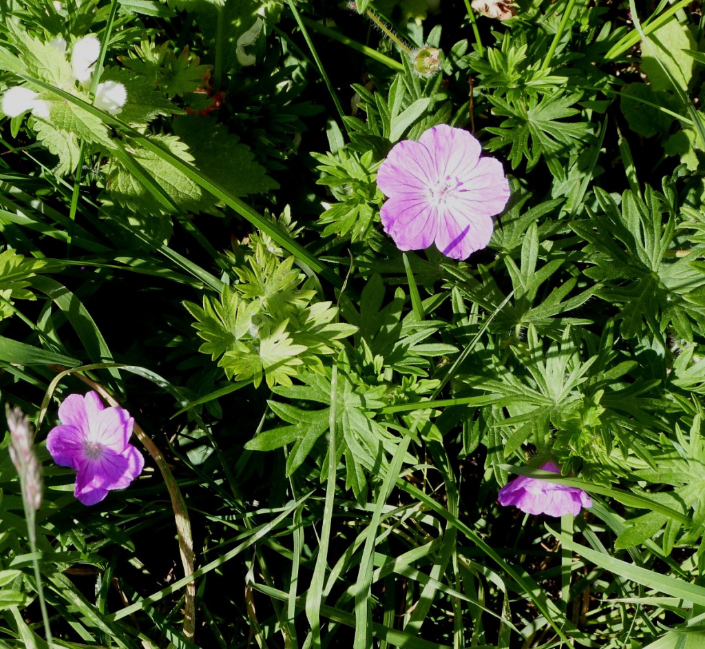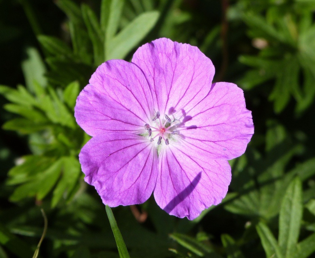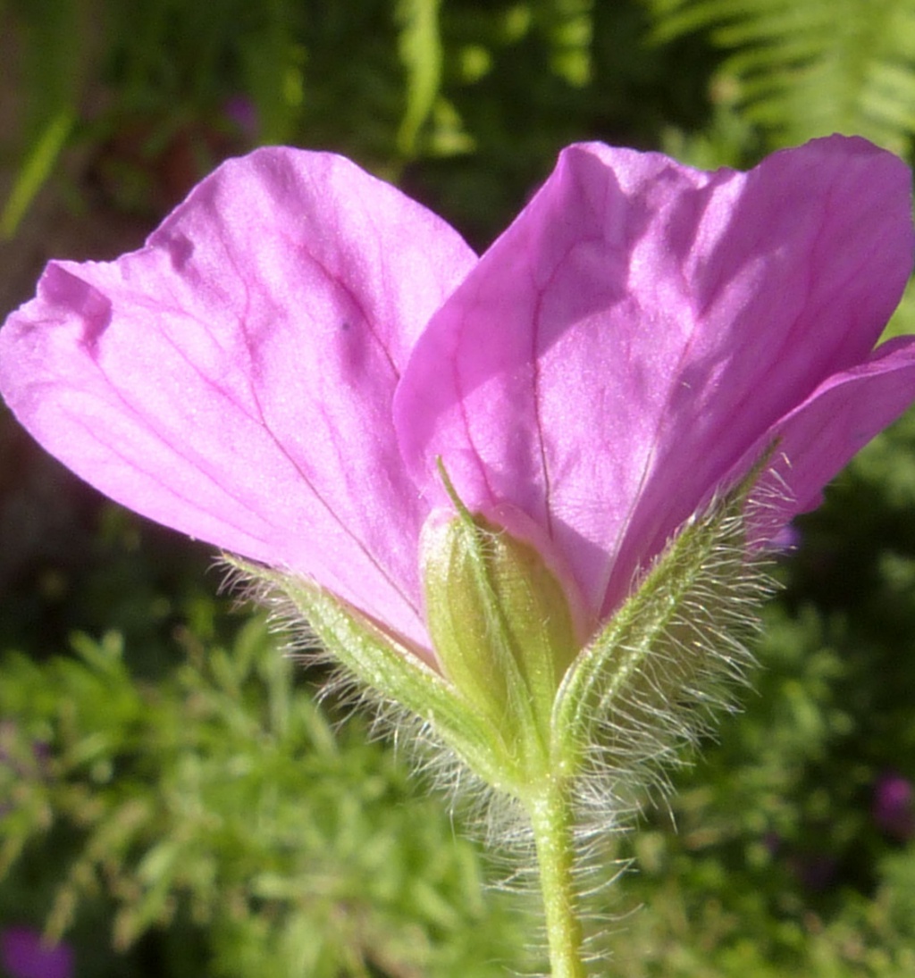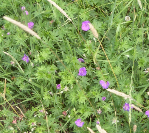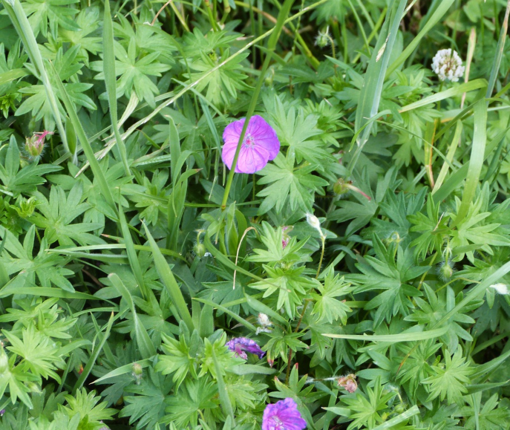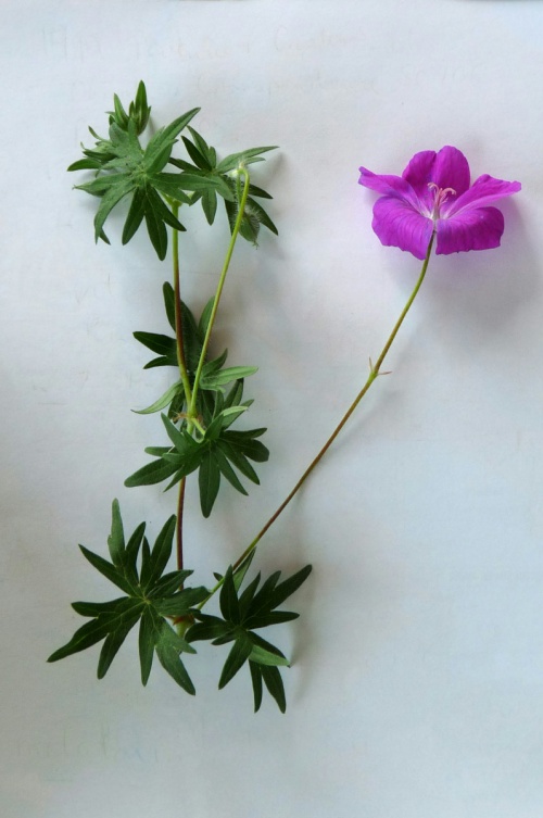 Short medium hairy plant with a stout horizontal rhizome. Stems much branched, erect or spreading. Leaves are rounded in outline but split into 5 to 7 pinnately divided lobes. Flowers usually deep reddish purple, 25 to 30 mm across, usually solitary the petals slightly notched and the stalks with a pair of small bracts near the centre.