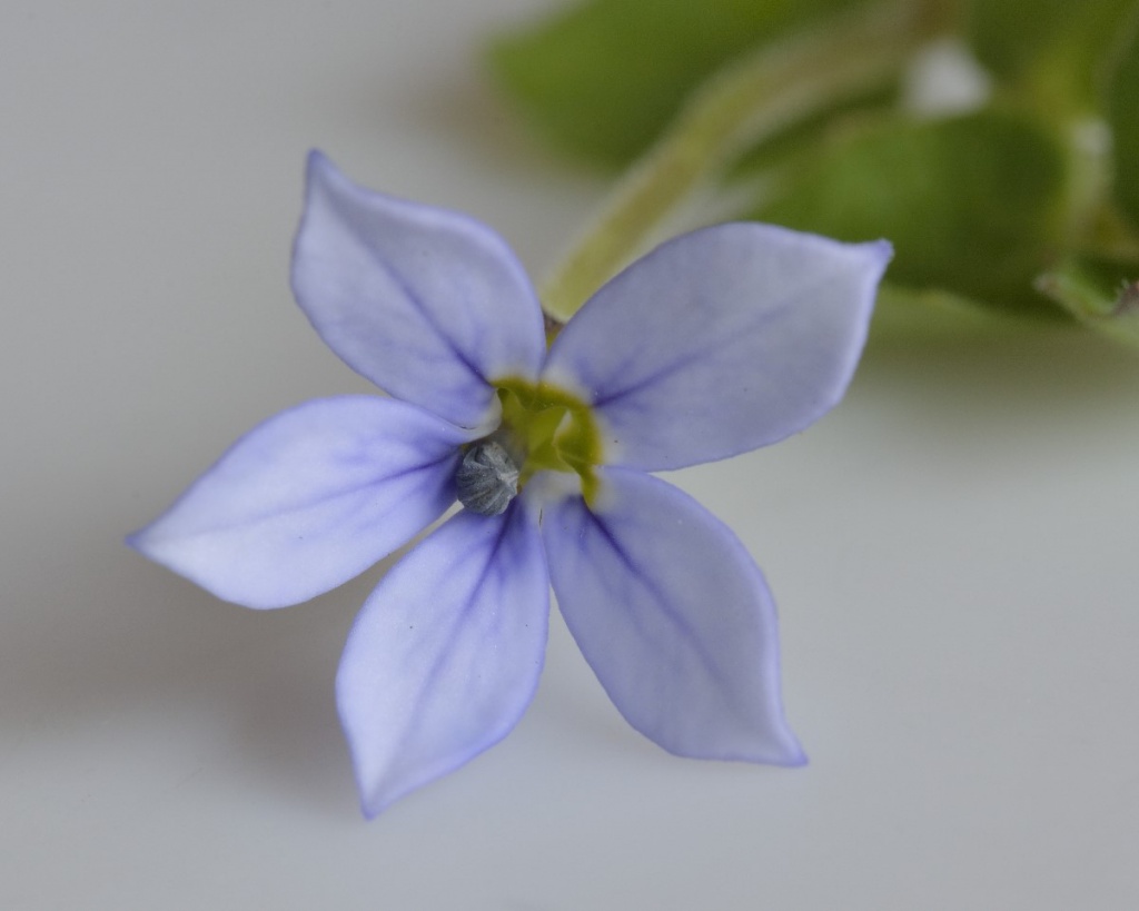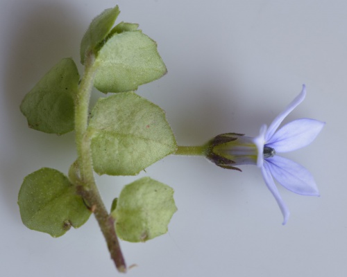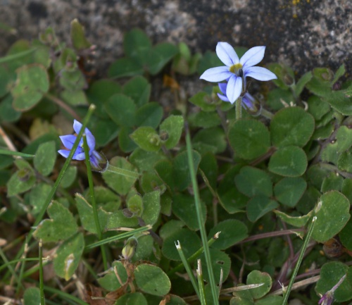 A ground covering plant with very small, blue, five petalled star-shaped flowers.