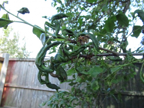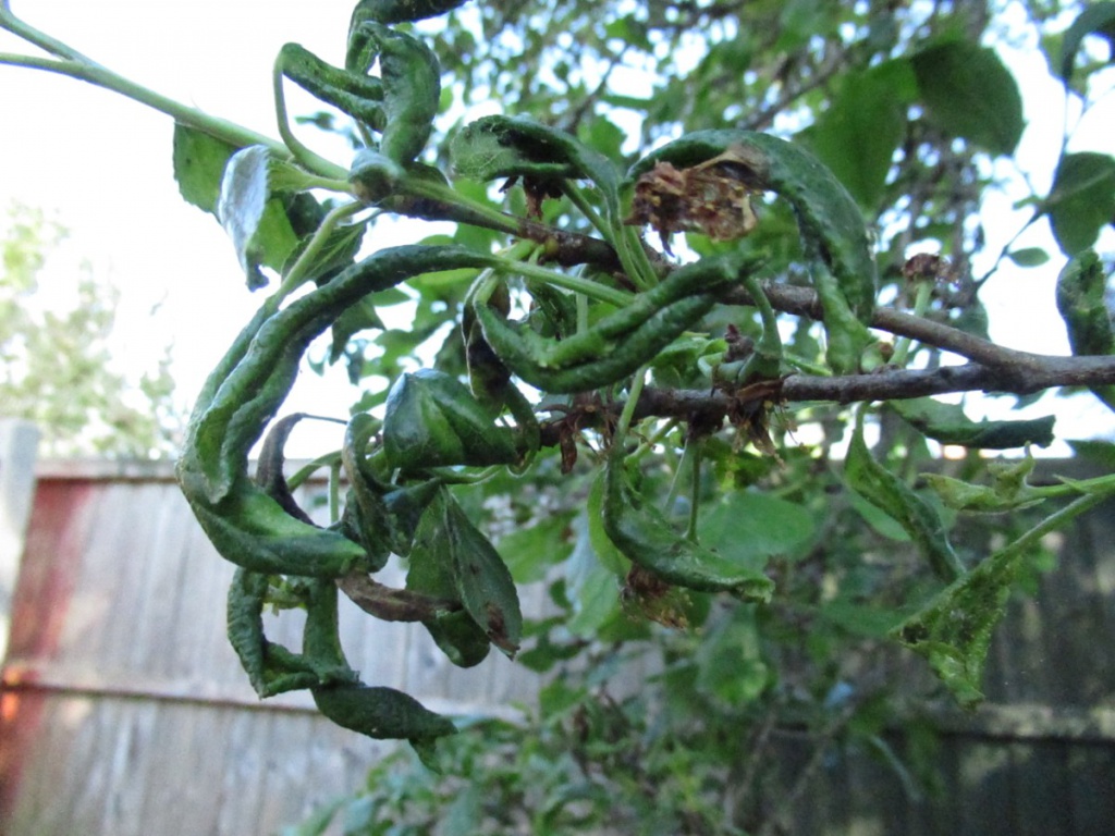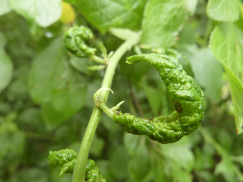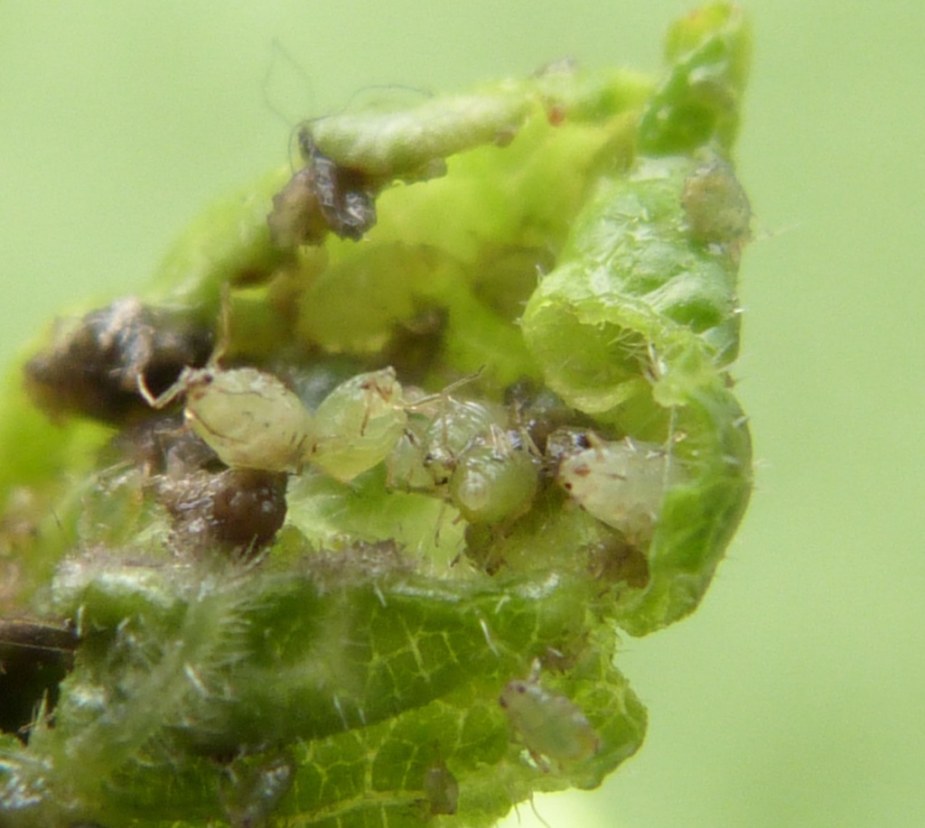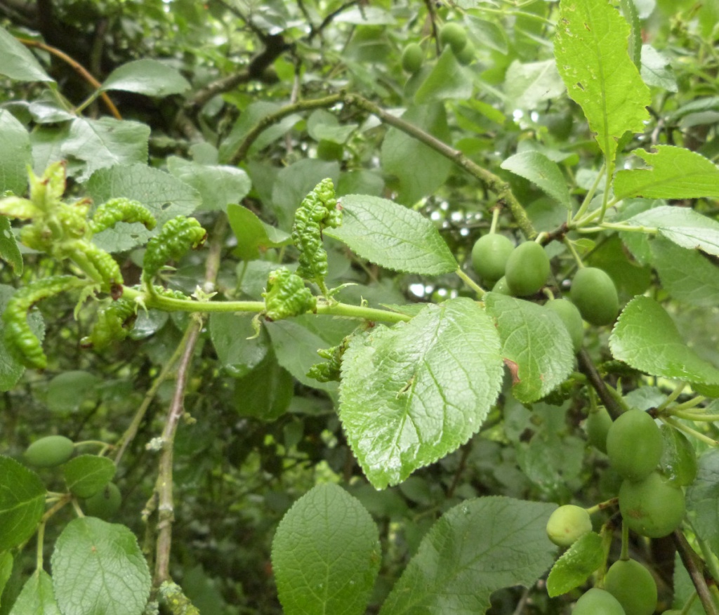 Brachycaudus helichrysi aphids causes distortion of leaves of various Prunus species (primary host) causing the leaves to become rolled up tightly in spring. These are not true galls, and other aphids may cause similar leaf distortions.
