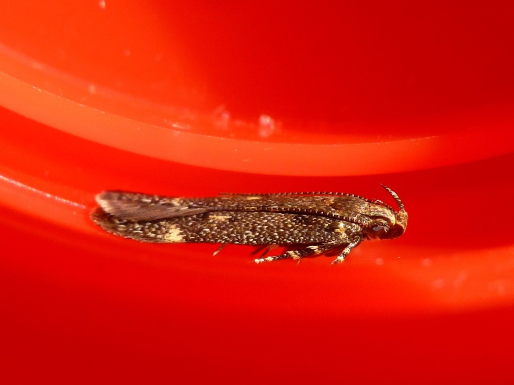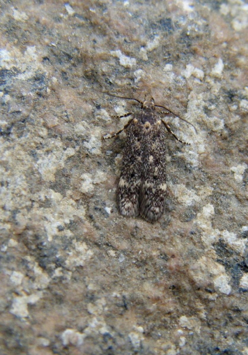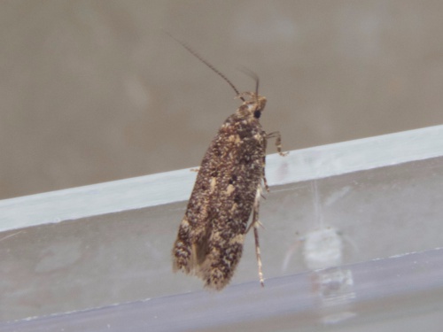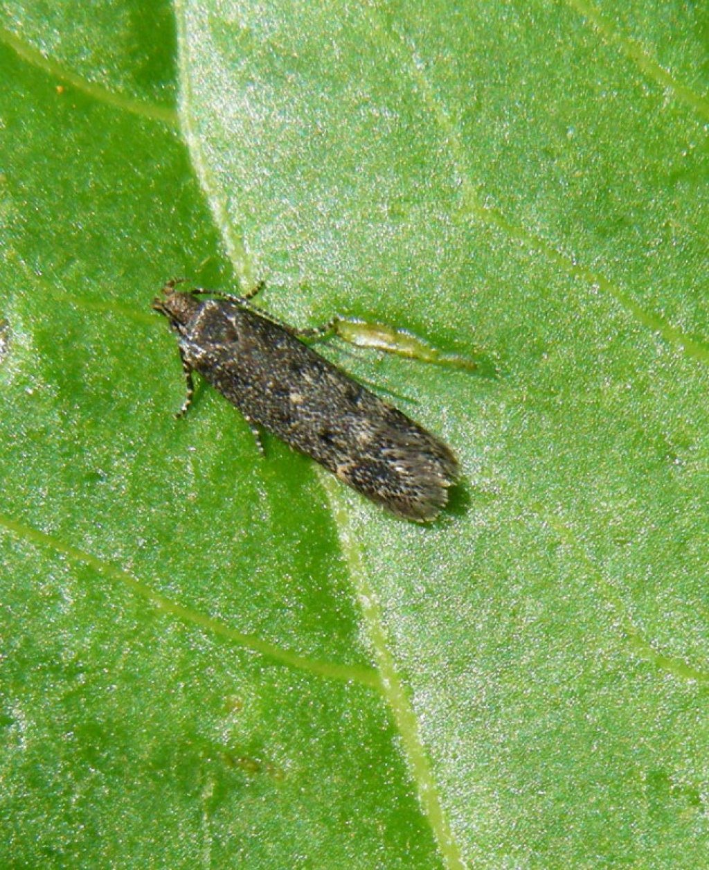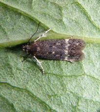 Wingspan 11-12 mm. This moth has a variable paler band, sometimes broken, across the forewing about three quarters of the way toward the tip.