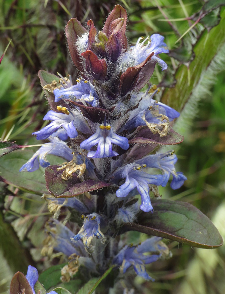 A hairy plant up to about 20 cm tall, with long rooting runners. Stems hairy on two opposing sides often rather woolly. Leaves oval slightly toothed and often flushed with bronze. Flowers violet blue 14 to 17 mm in leafy spikes, dense at first.