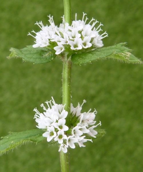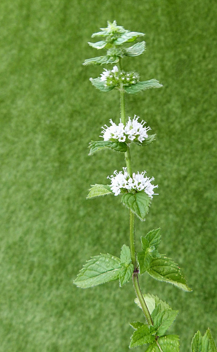 This is a hybrid between Corn Mint (Mentha arvensis) and Spear Mint (Mentha spicata). It may reach between 6 and 24 inches in height. The erect central stem is light green to reddish purple and square (four angled). Leaves are ovate and toothed. The very pale lilac flowers occur in whorls above the middle and upper leaves but there are no terminal flowers at the top of the stem.