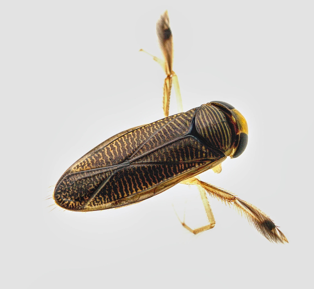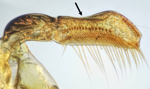 7-8mm. This species is similar to several other species of water boatman and detailed examination is necessary for a sound id. As with other species it has a gold and black wave pattern on the pronotum and elytra. Both sexes have a black 'square' at the end of the tarsus on the hind leg. The male pala has a characteristic hump along the top towards the tip.